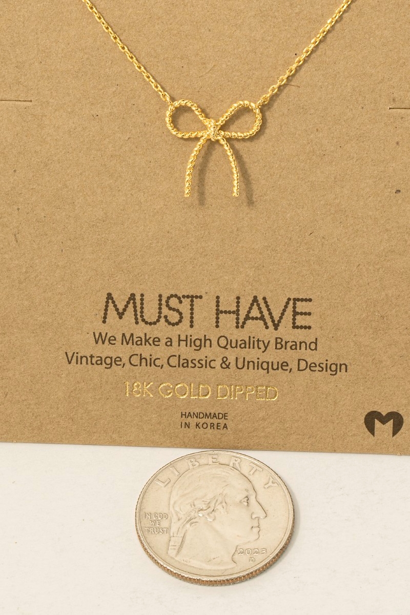 • This trending necklace brings a luxurious gold dipped textured ribbon bow pendant chain necklace style. Redefine your look effortlessly with this standout, on-trend piece.