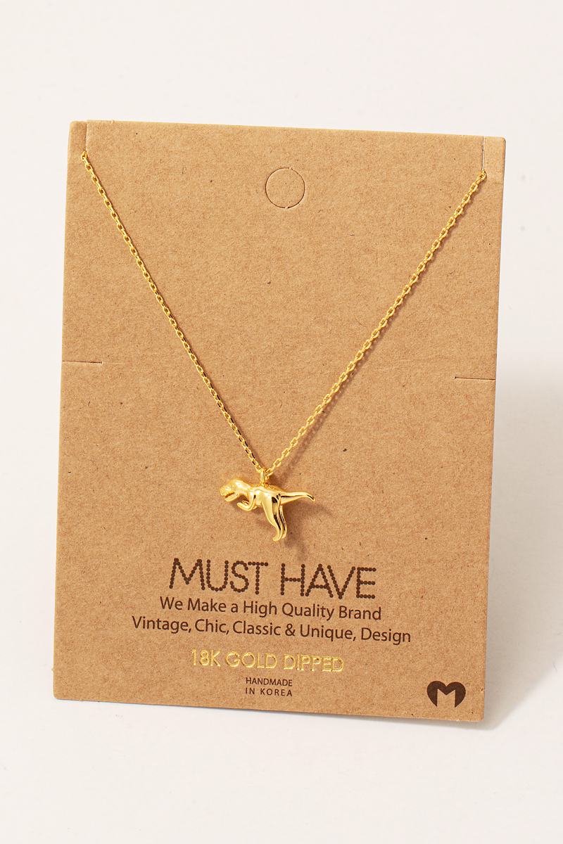 - This necklace showcases a unique gold dipped t-rex dinosaur pendant style. Step into a world of refined taste as this necklace effortlessly refines the details of your outfit.