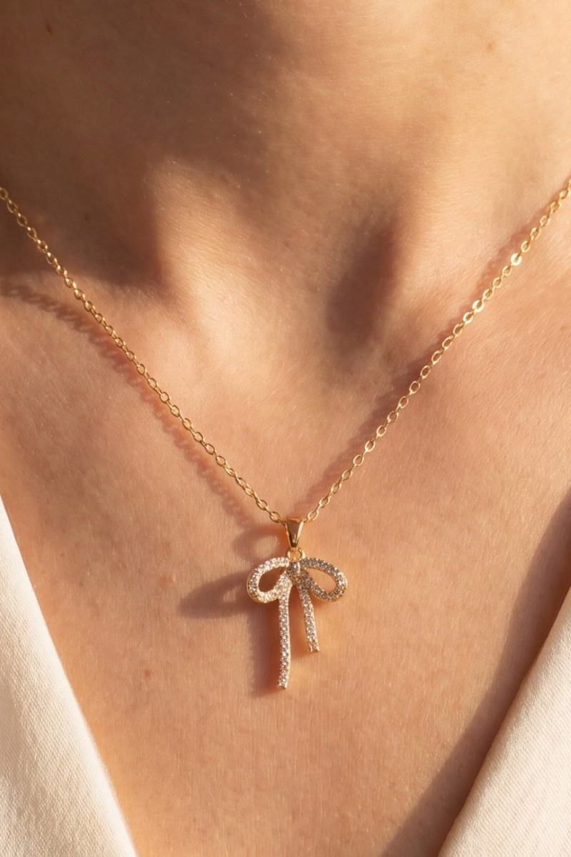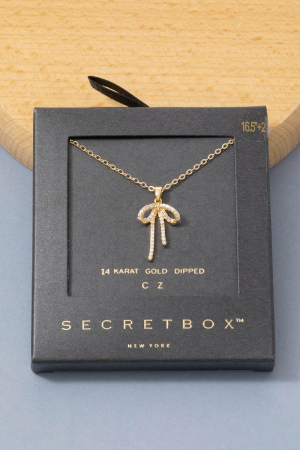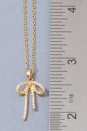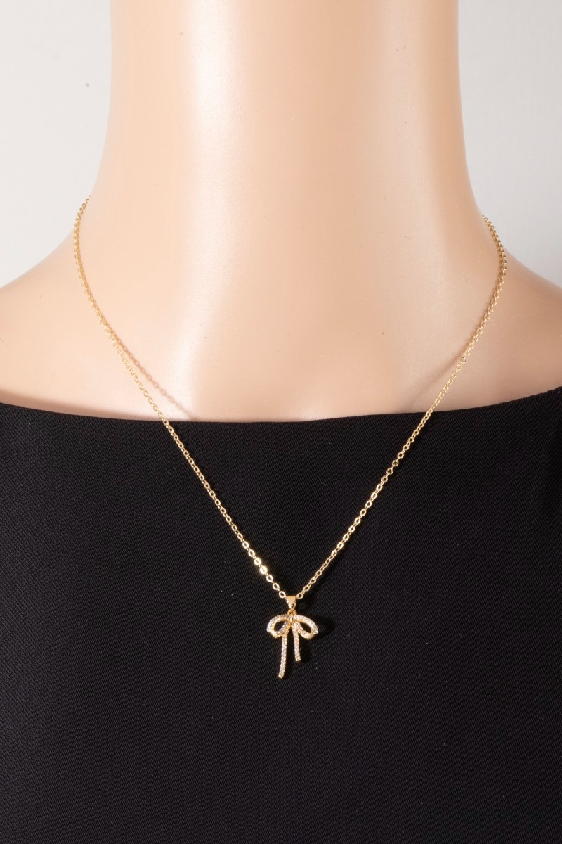 - This pendant necklace showcases a unique 14k gold dipped cubic zirconia bow style. Indulge in the allure of exquisite craftsmanship as this pendant necklace effortlessly adds a touch of luxury to your attire.