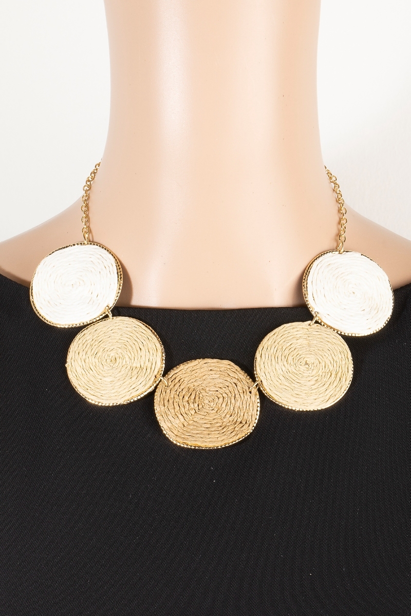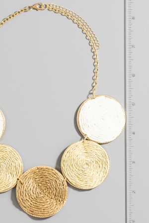 • This chain necklace displays a vibrant 3 tone straw discs statement style. Discover the perfect balance of subtlety and flair as this chain necklace effortlessly completes your look.