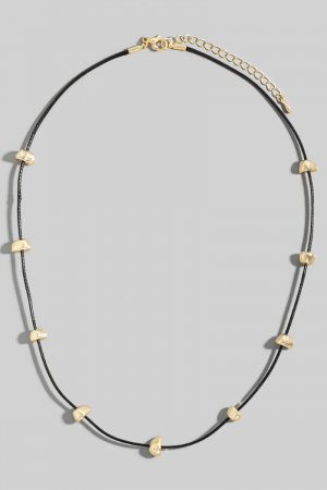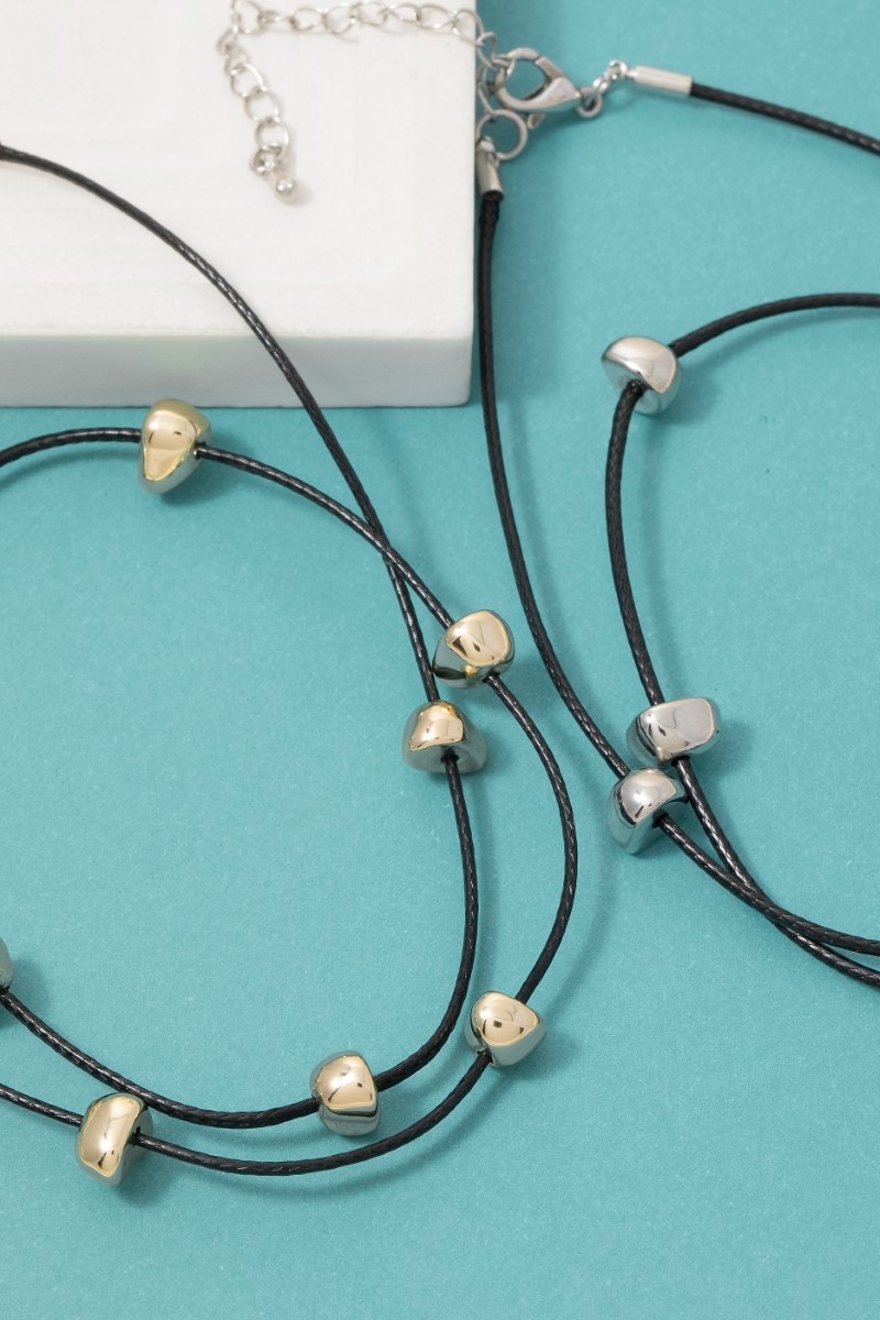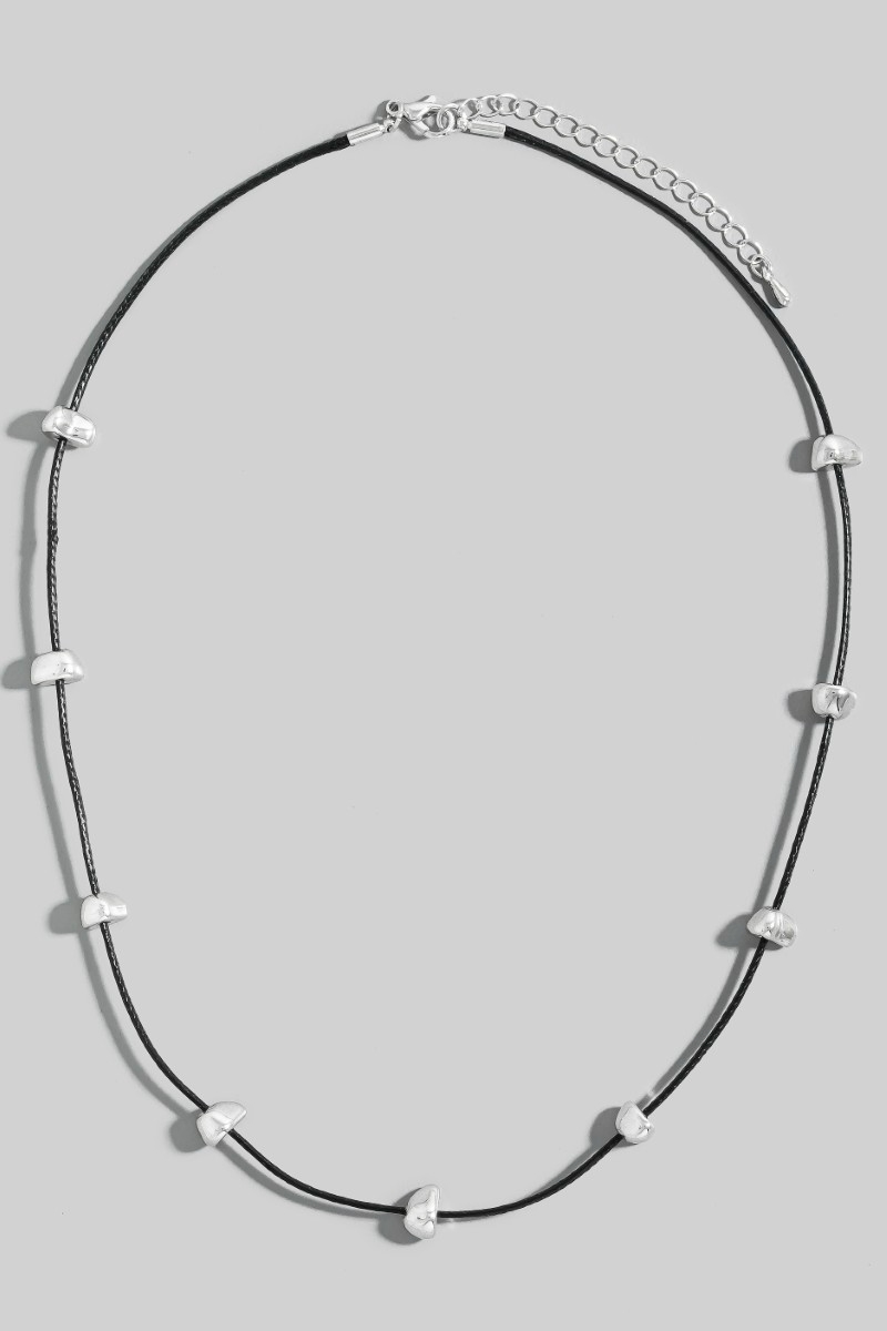 - This necklace showcases a unique abstract metallic charms cord style. Indulge in the allure of exquisite craftsmanship as this necklace effortlessly adds a touch of luxury to your attire.