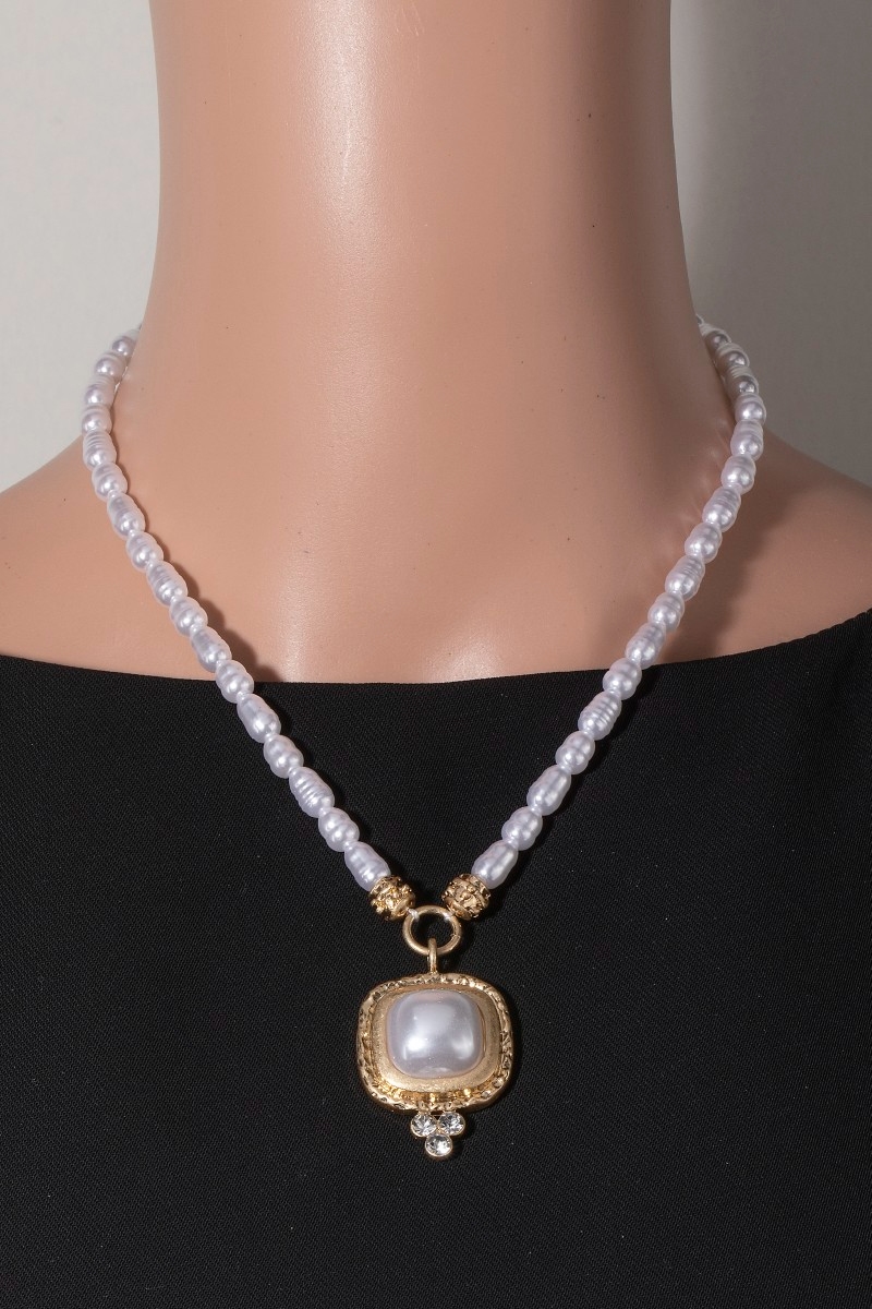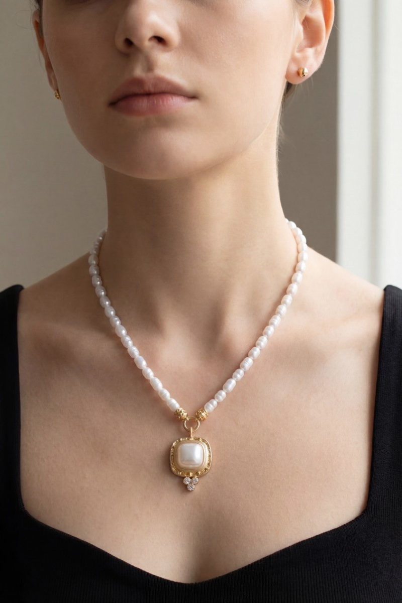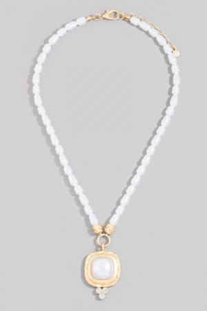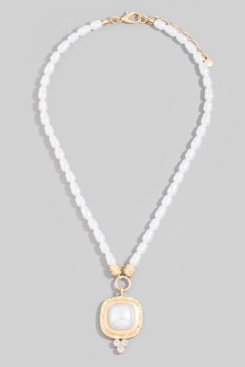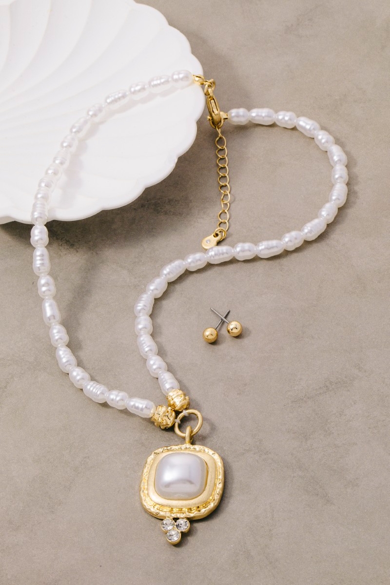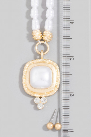- This necklace set introduces a unique pearl beaded square pearl pendant style. Revel in the intricate design that effortlessly distinguishes this necklace set, making it a statement piece.