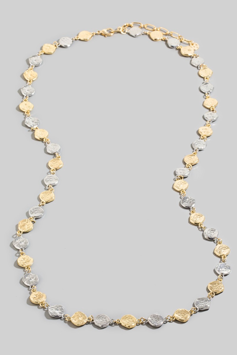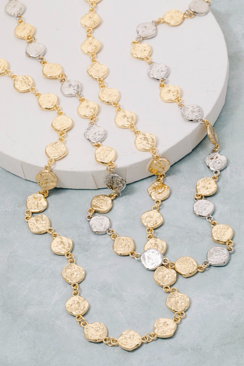 • This chain necklace displays a fashionable small textured coins long style. Immerse yourself in fashion finesse with this statement chain necklace.