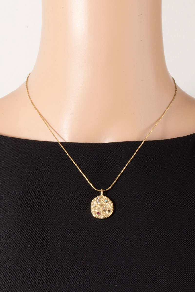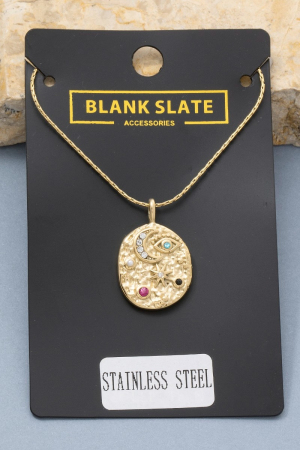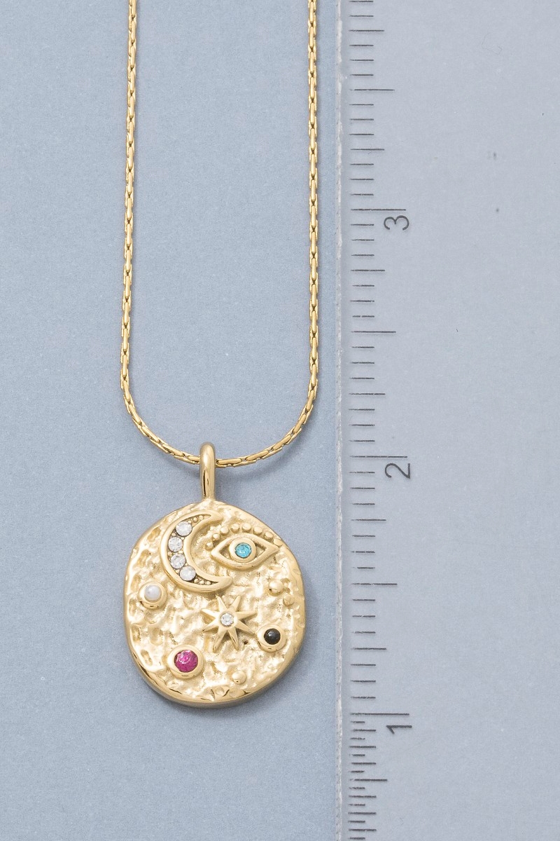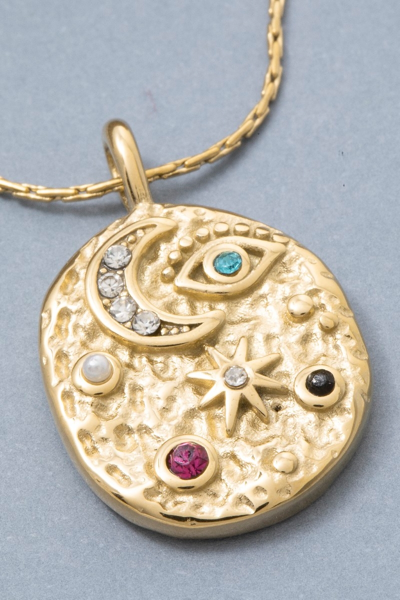 - This pendant necklace brings a unique celestial eye and moon crystal coin style. Indulge in the artistry of accessorizing with this unique piece.