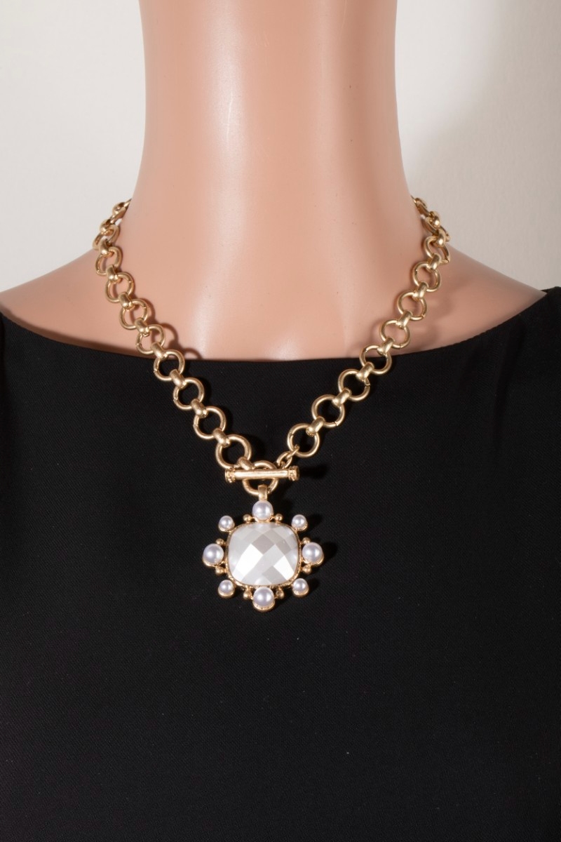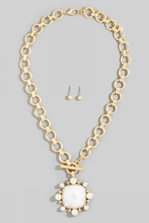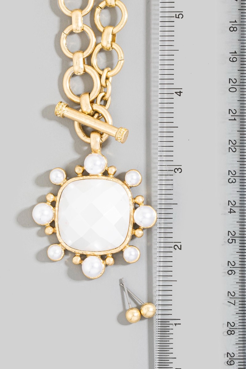 • This necklace set features a fashionable chain link faceted square stone pendant style. Elevate your ensemble with this necklace set that effortlessly captures the essence of refined fashion.
