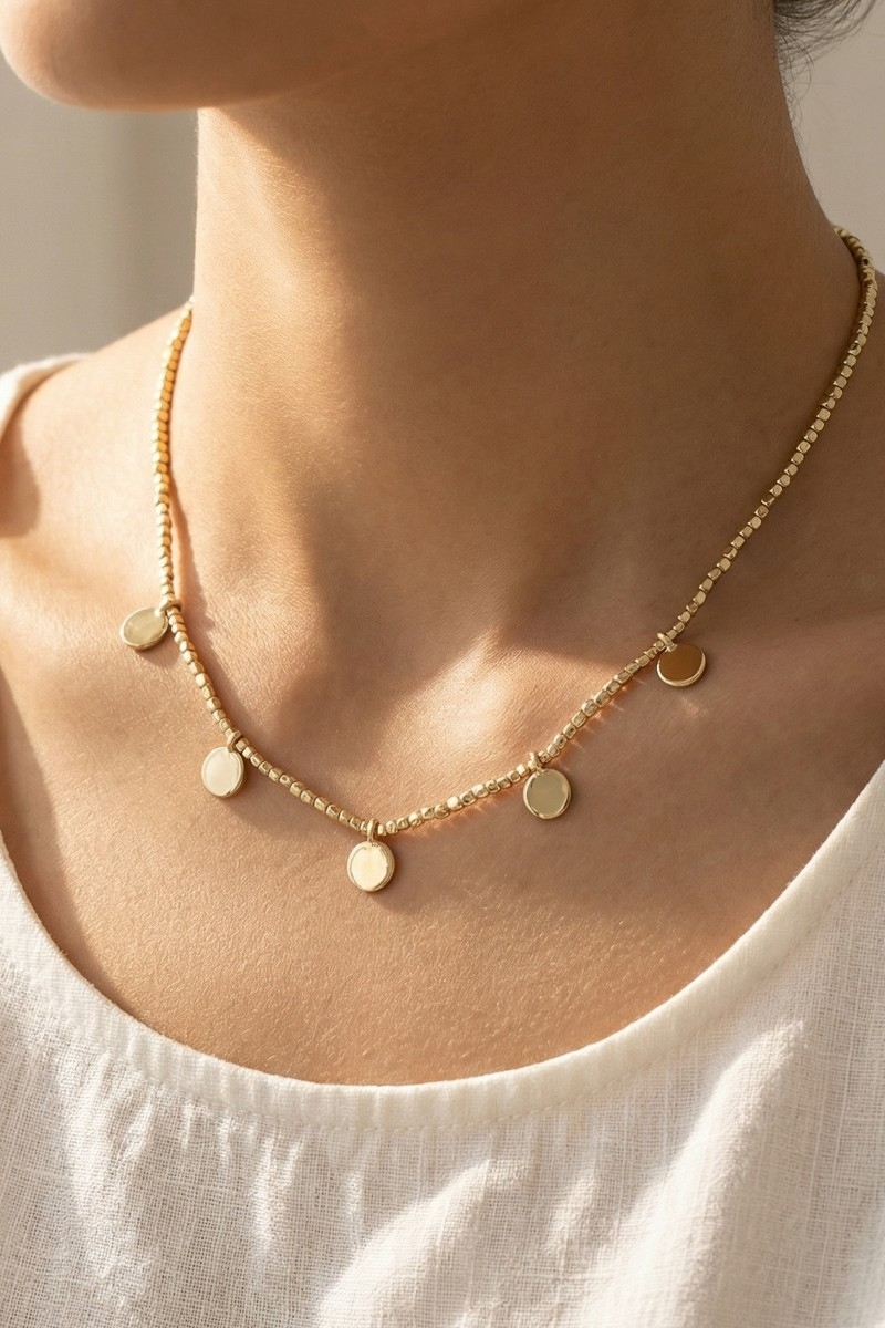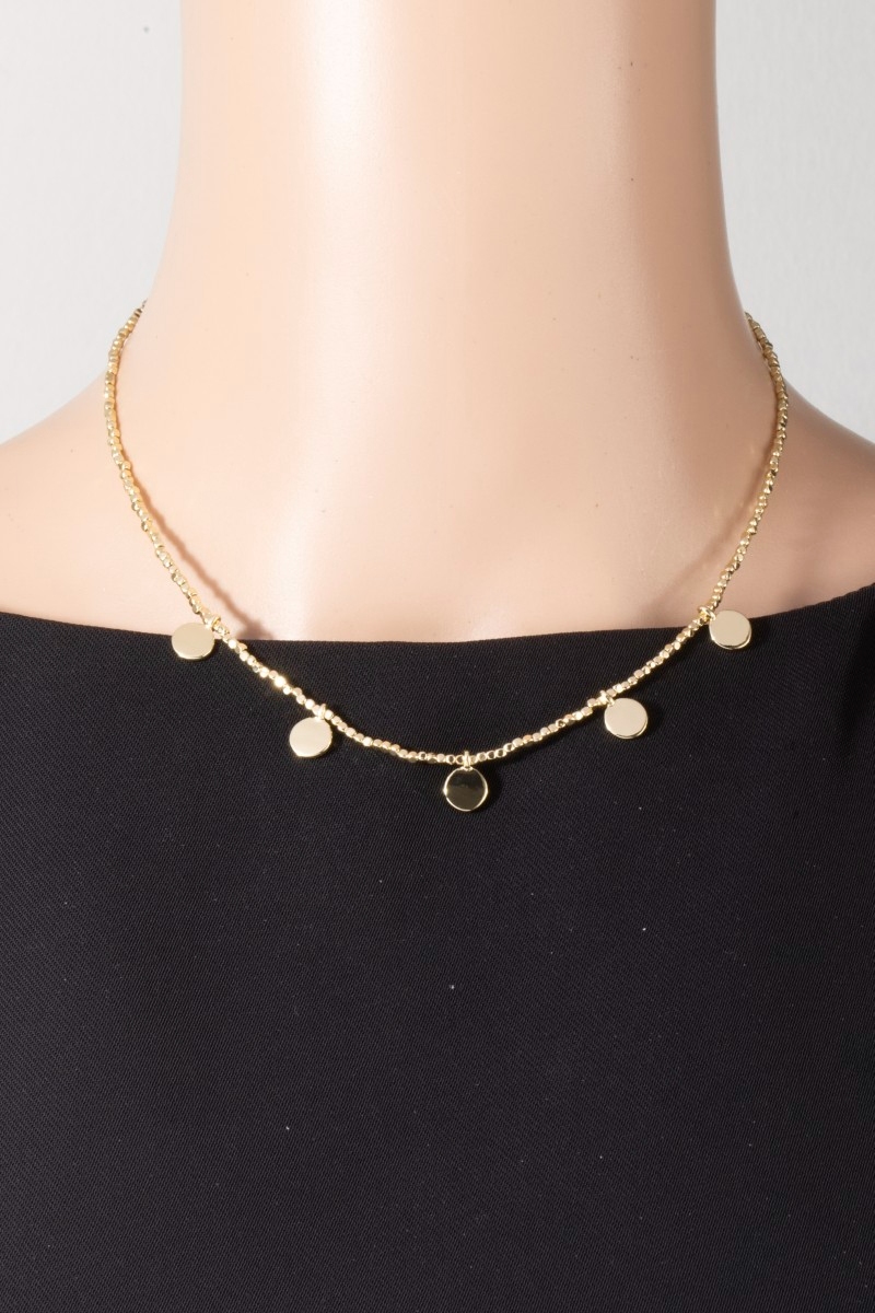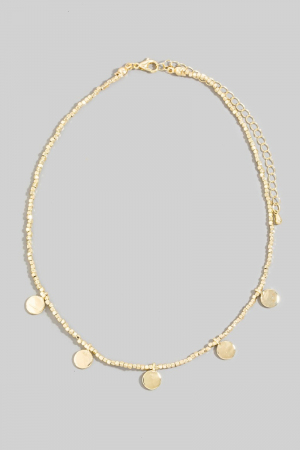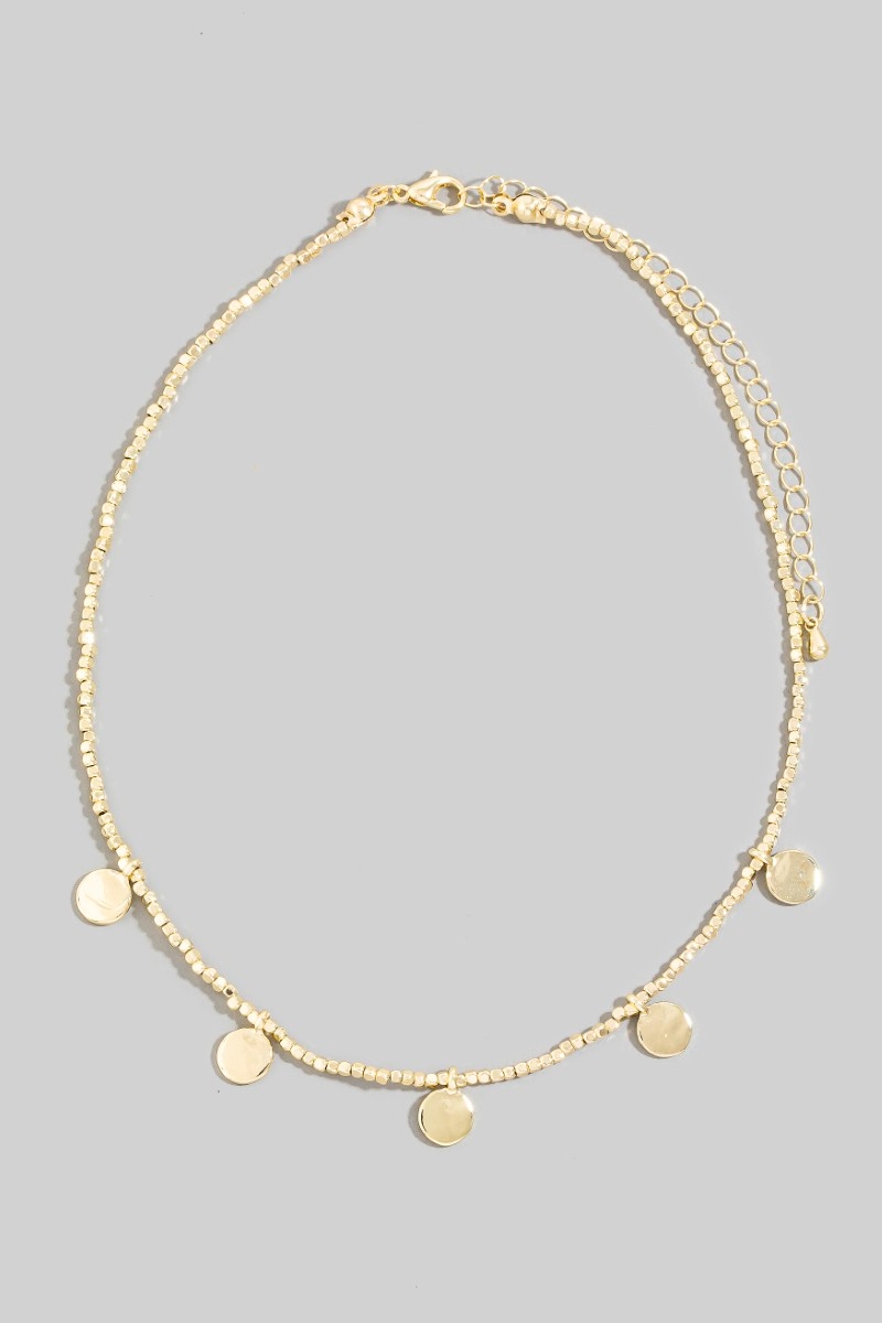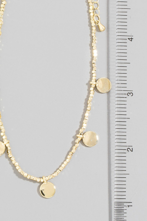 • This chain necklace features a fashionable beaded chain coin disc station necklace style. Revel in the intricate design that effortlessly distinguishes this chain necklace, making it a statement piece.