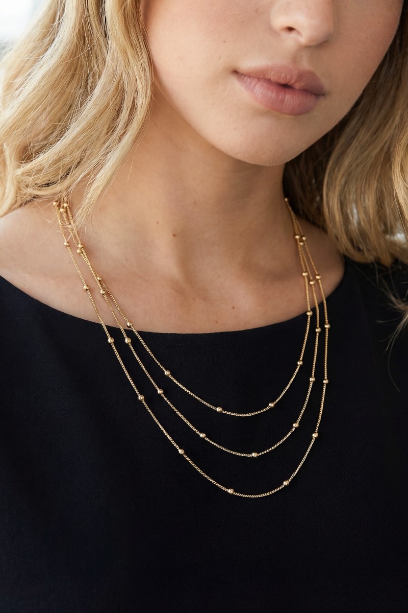 - This chain necklace showcases a unique dainty layered style. Immerse yourself in the world of understated glamour as this chain necklace effortlessly exudes timeless appeal.
