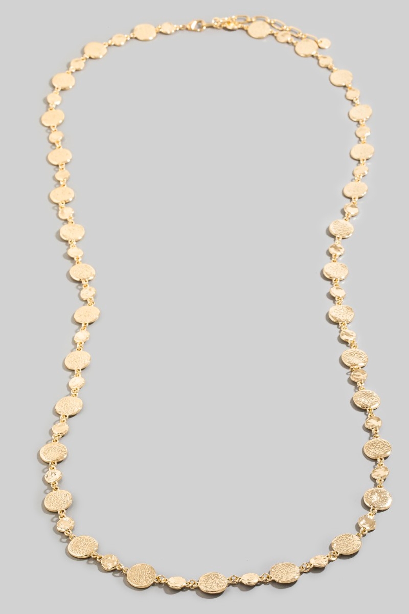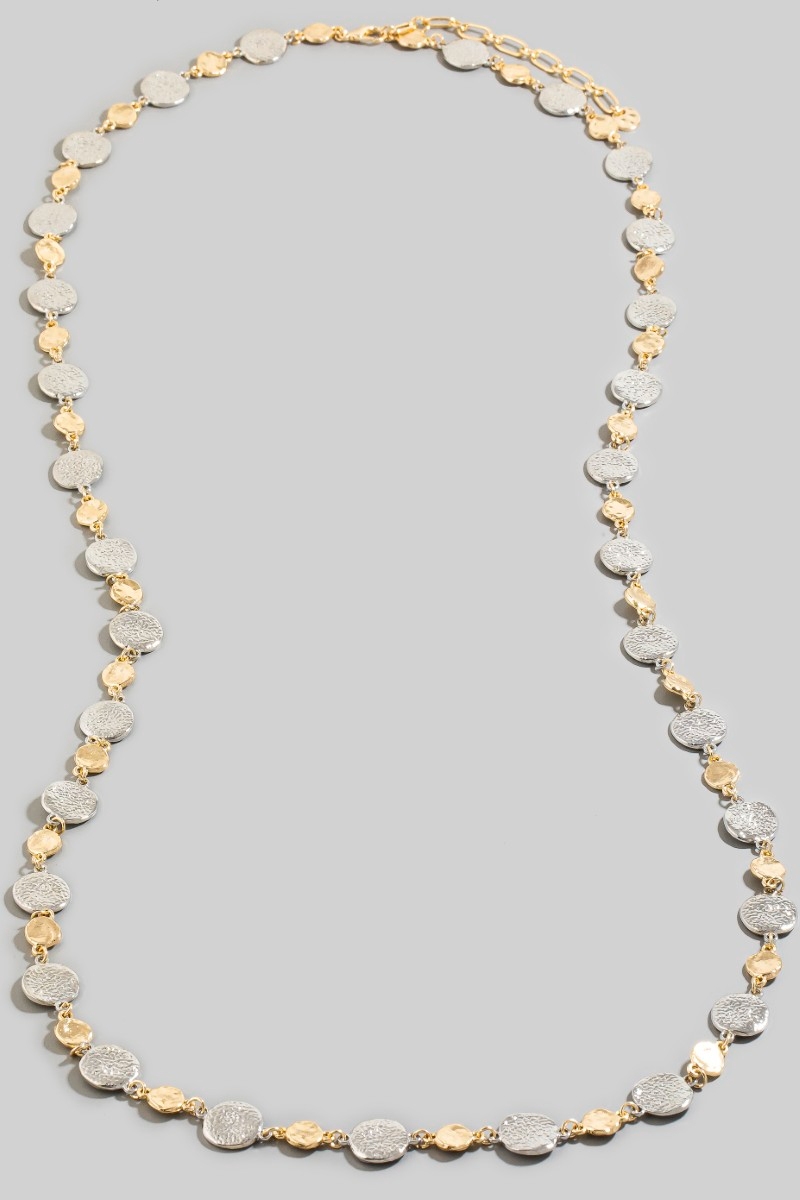 - This chain necklace showcases a timeless mixed textured coins long style. Celebrate individual style with this versatile, eye-catching addition.