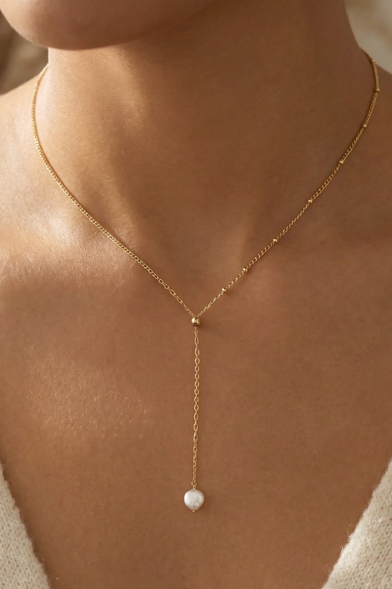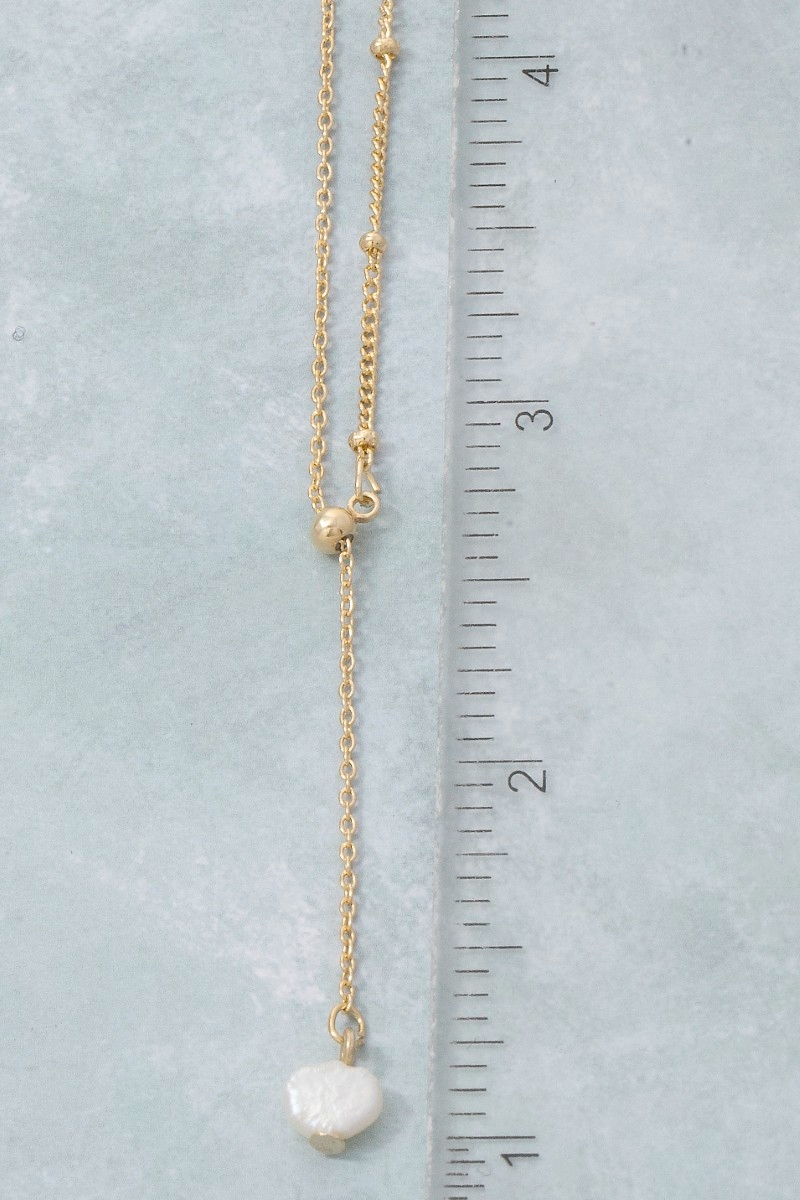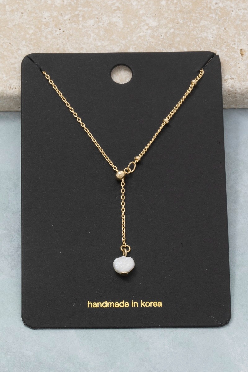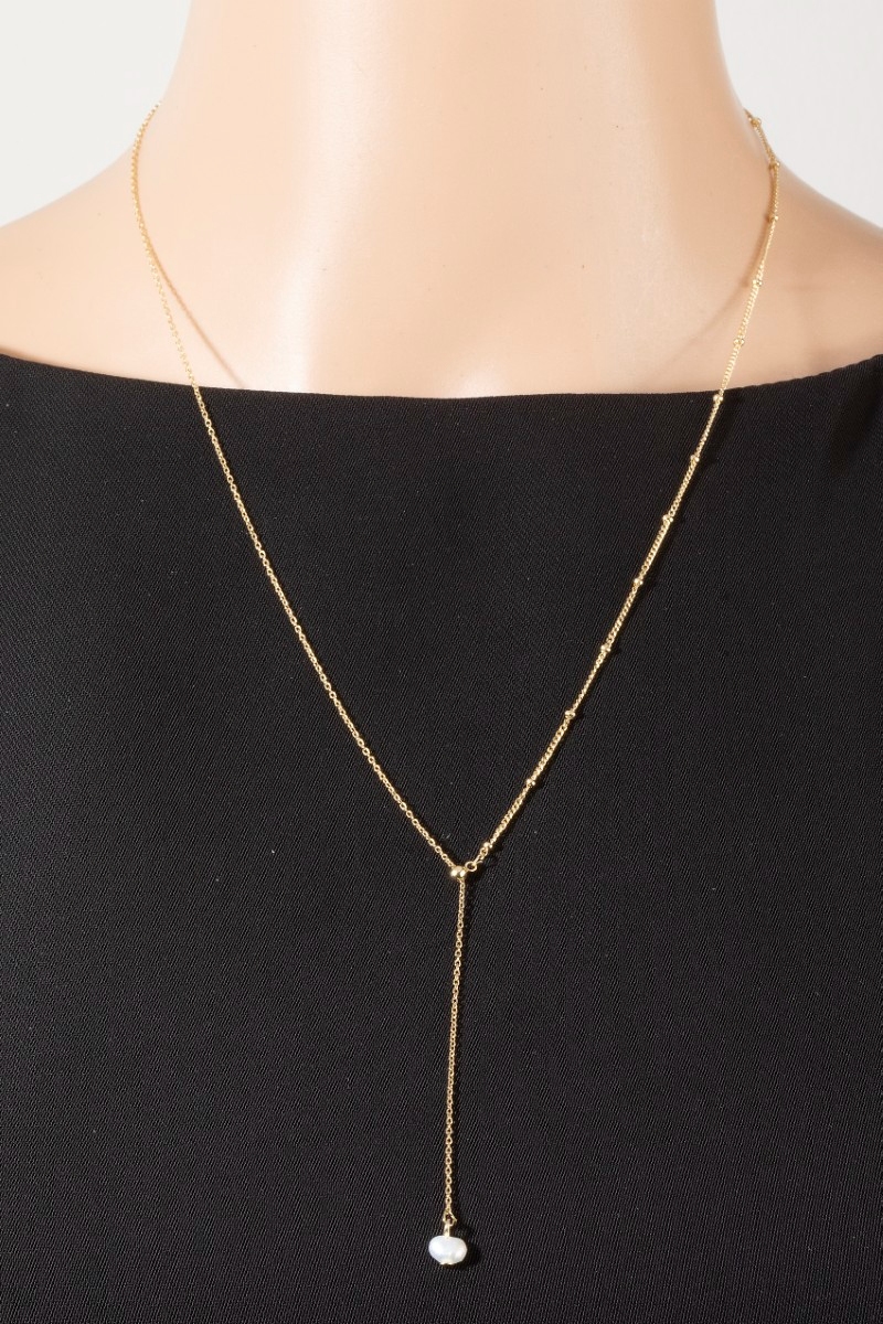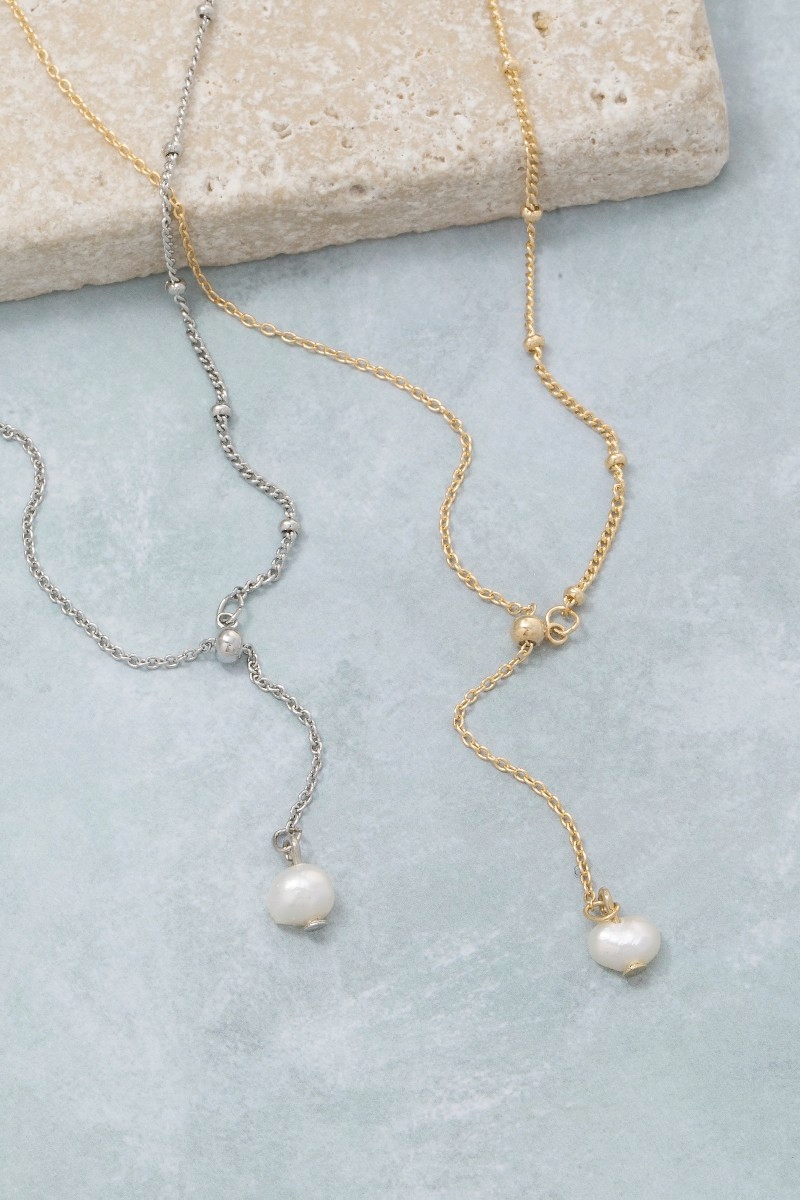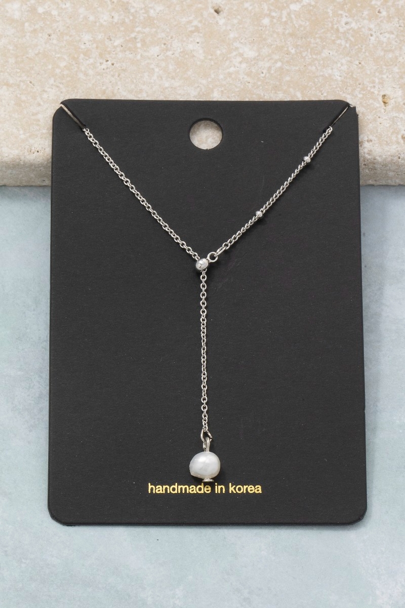 • This chain necklace displays a vibrant pearl charm lariat style. Celebrate individual style with this versatile, eye-catching addition.