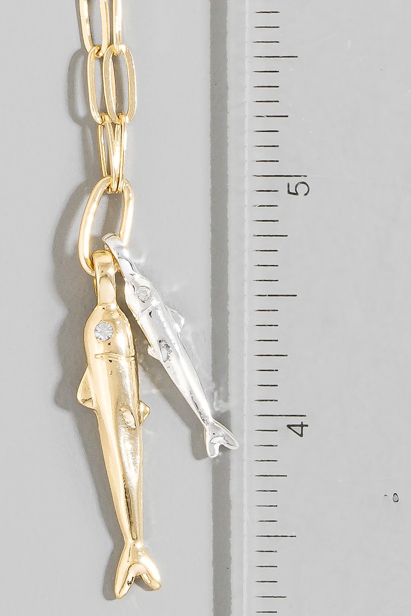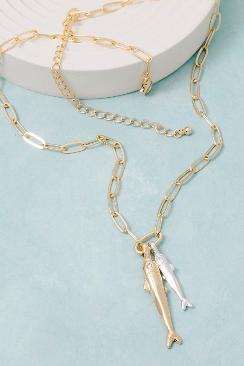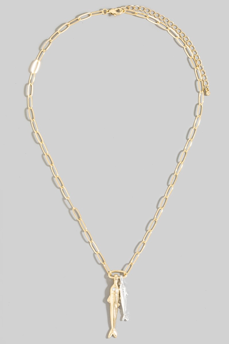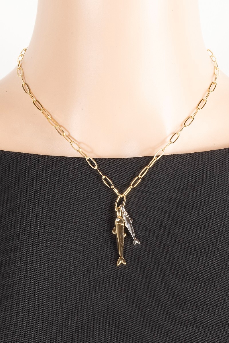 - This chain necklace features a fashionable two tone fish charms style. Witness the perfect fusion of style and functionality as this chain necklace effortlessly complements your lifestyle.