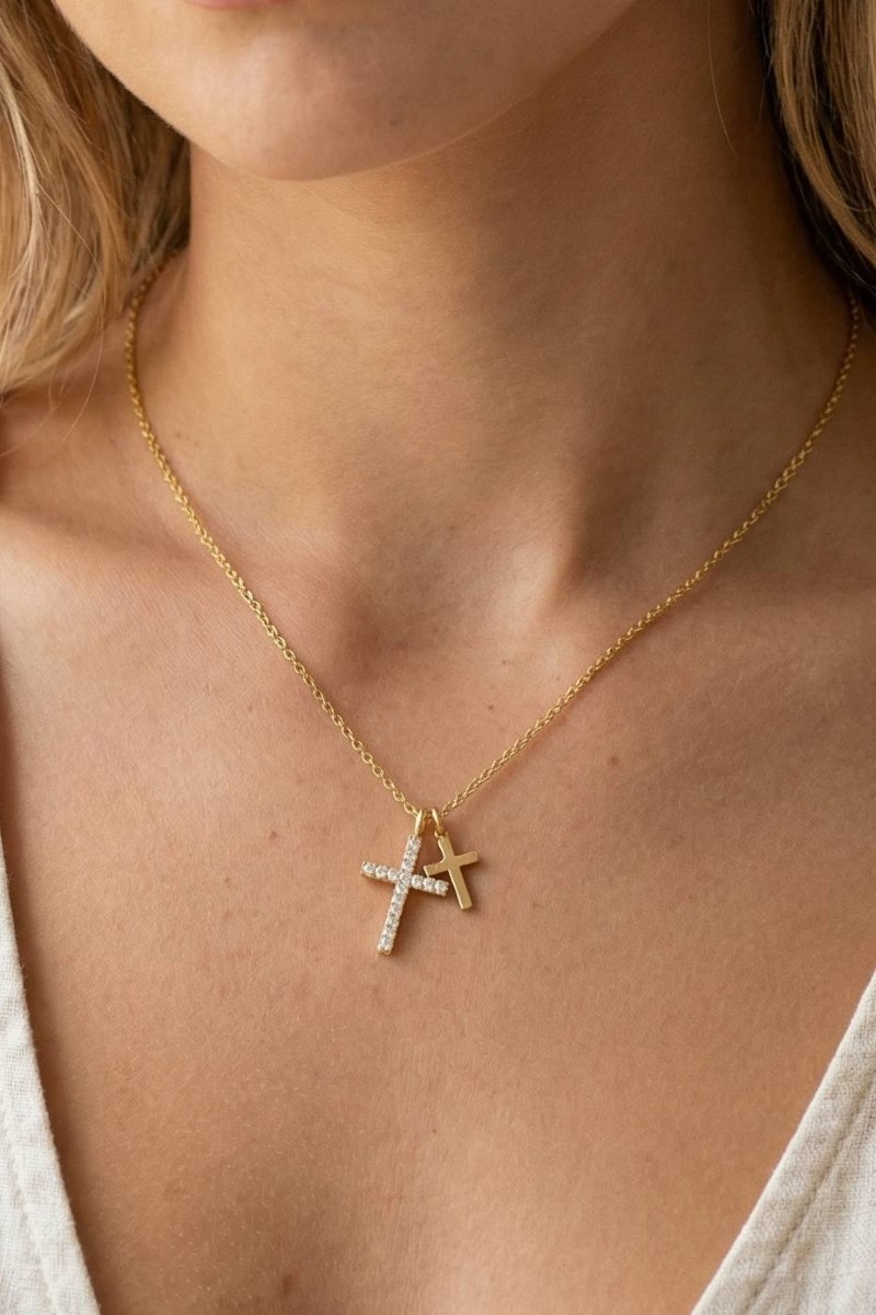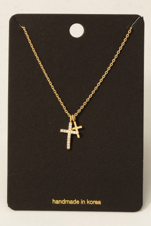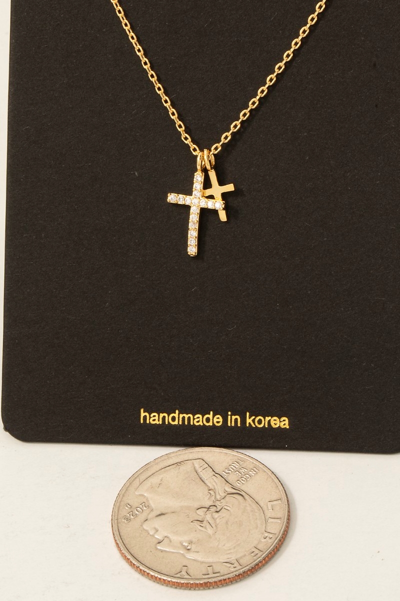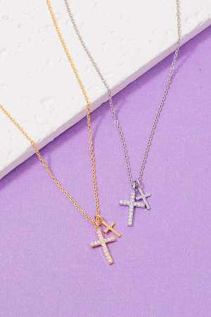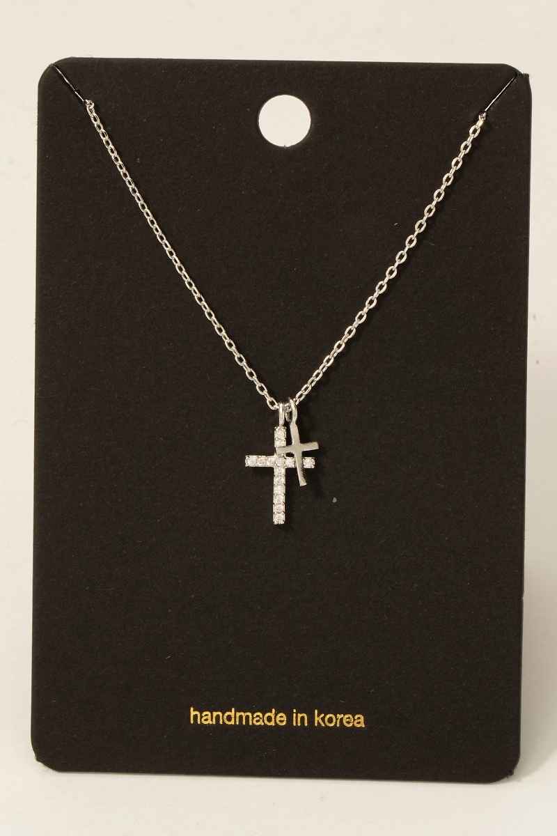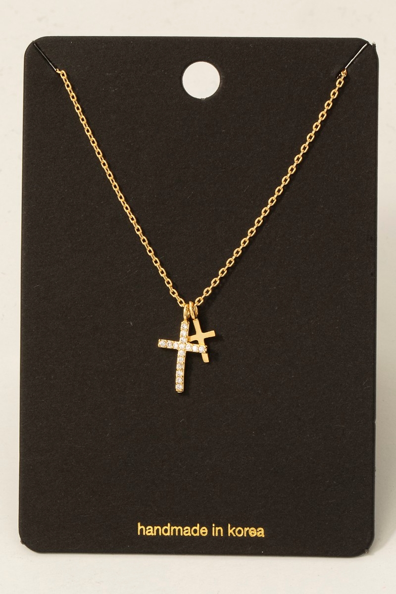 - This necklace showcases a unique cz pave double cross pendant style. Experience the joy of accessorizing with this piece that effortlessly combines versatility and charm.