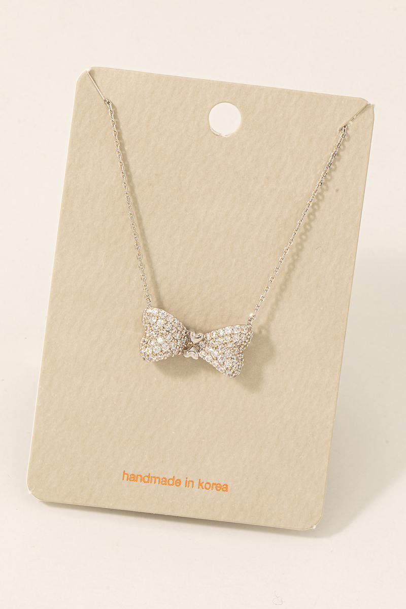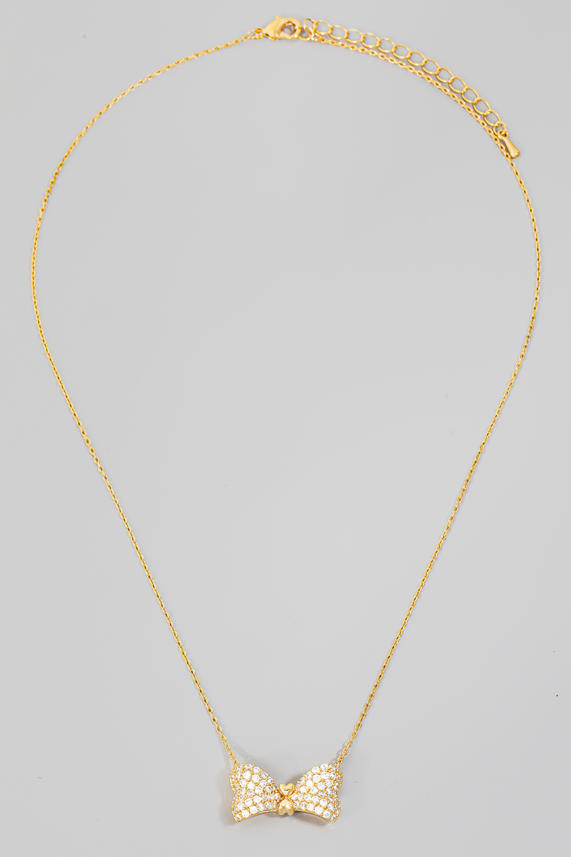 • This necklace showcases a timeless rhinestone pave ribbon bow pendant style. Experience a subtle blend of modernity and classic charm as this accessory effortlessly adorns your ensemble.
