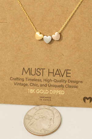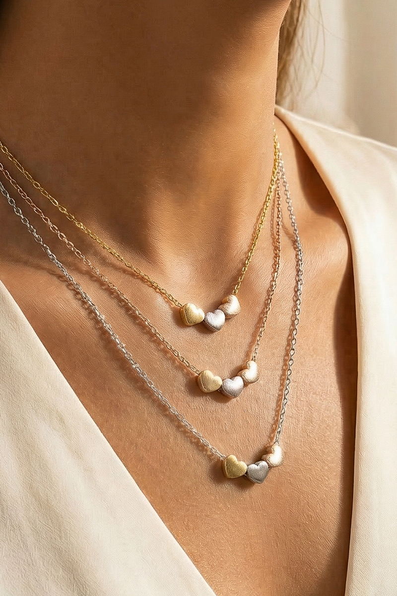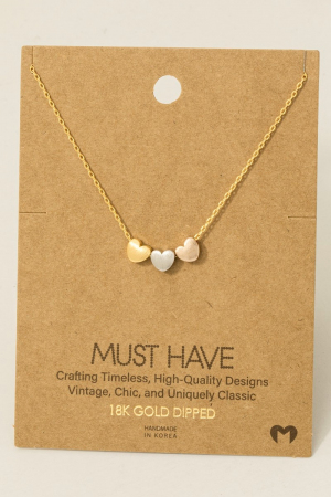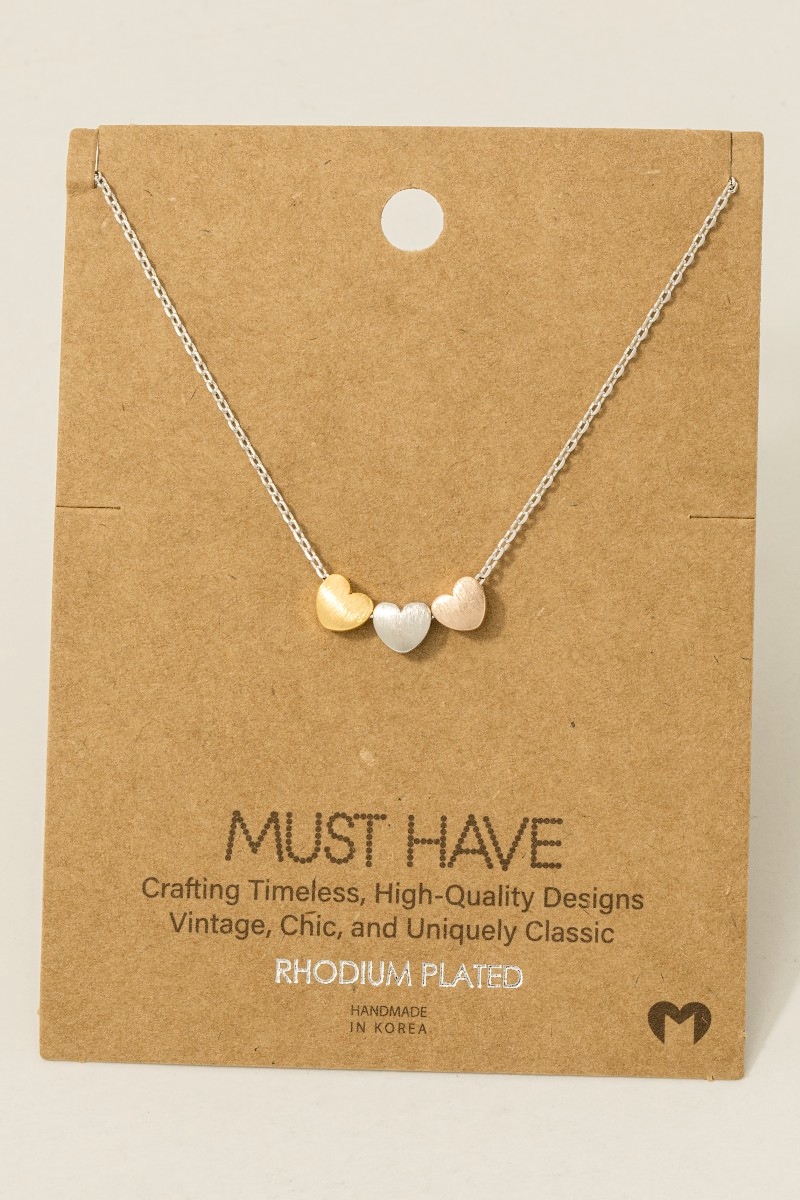 - This trending necklace displays a fashionable dainty three heart pendant necklace style. Indulge in the artistry of accessorizing with this unique piece.
