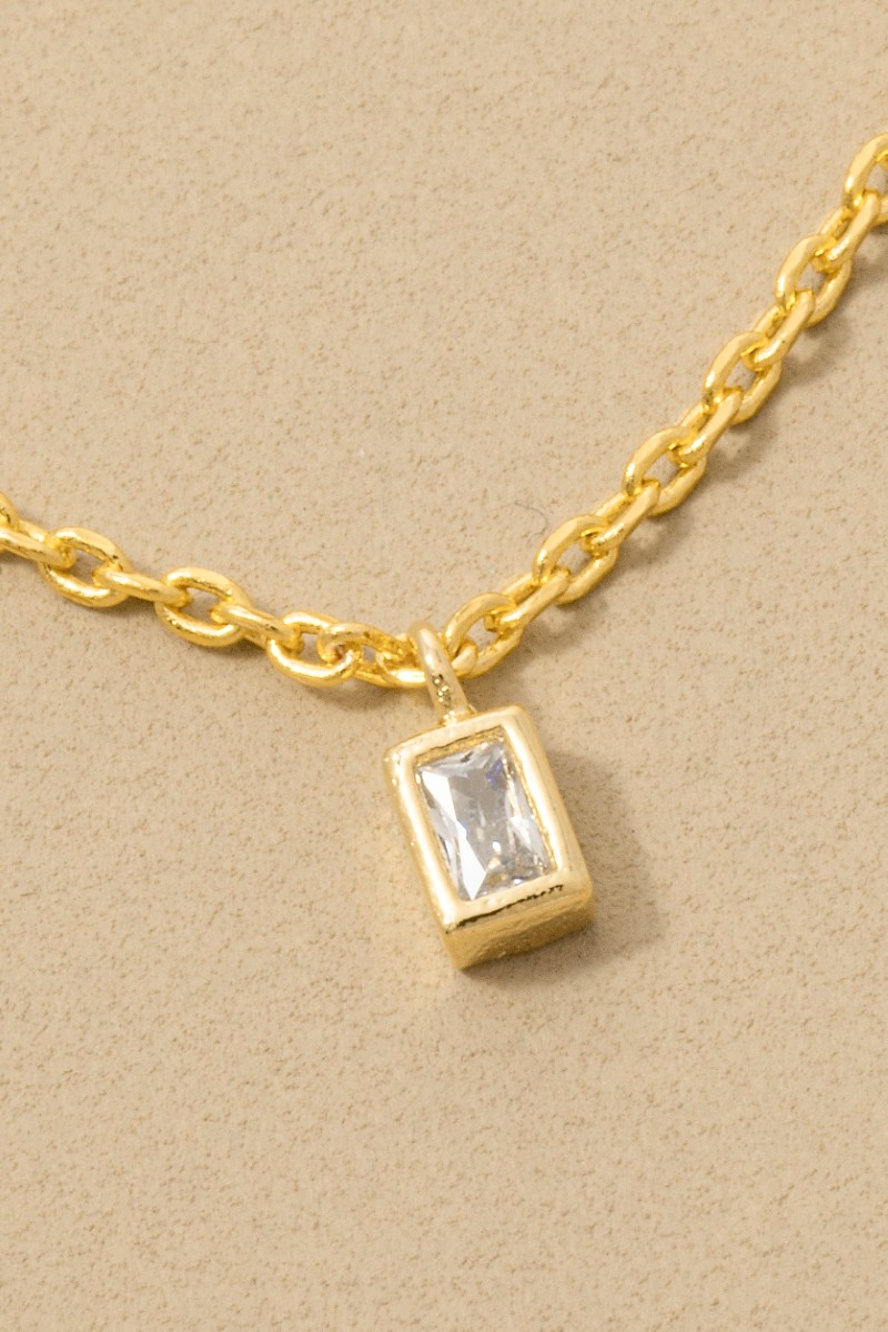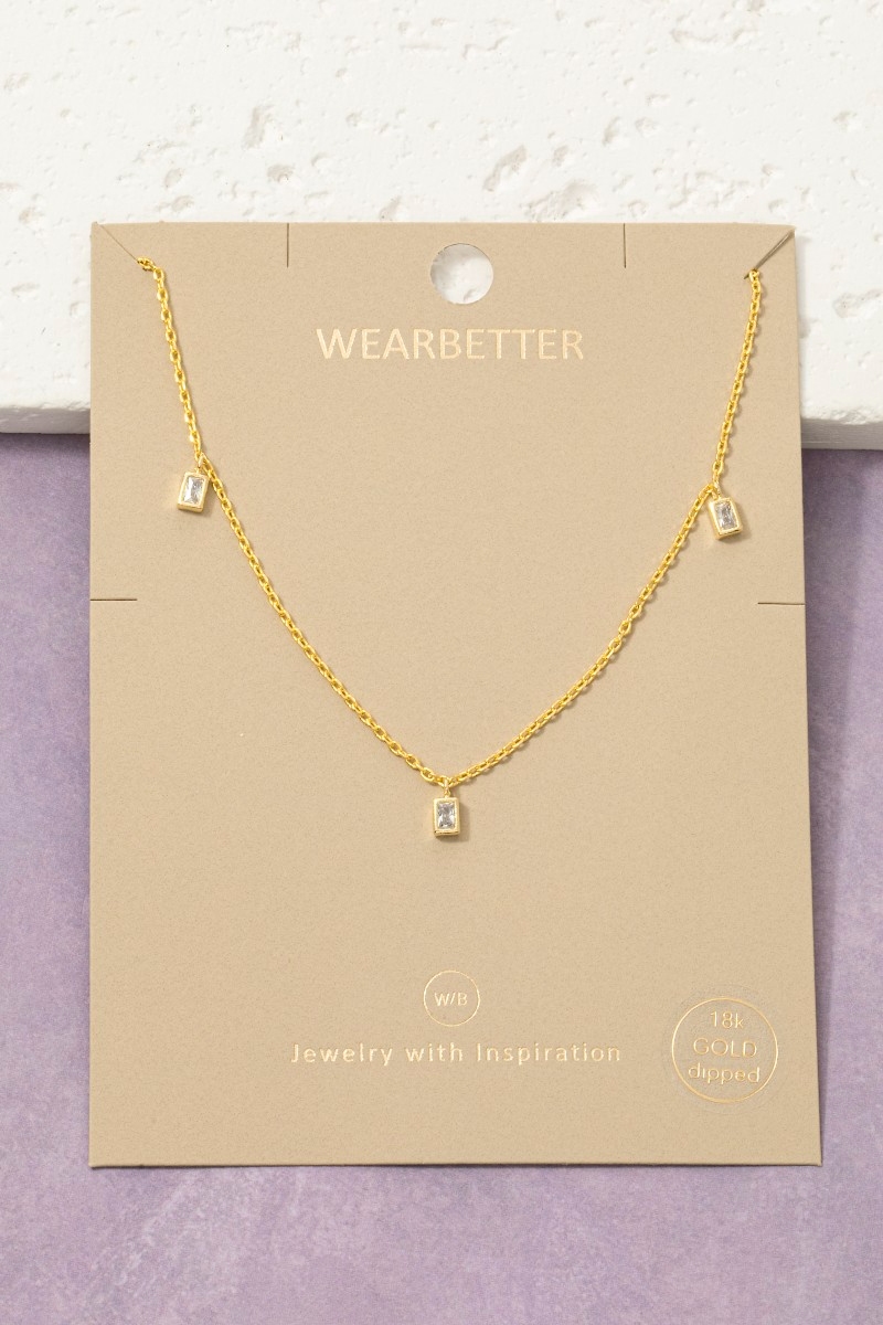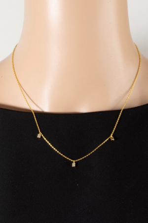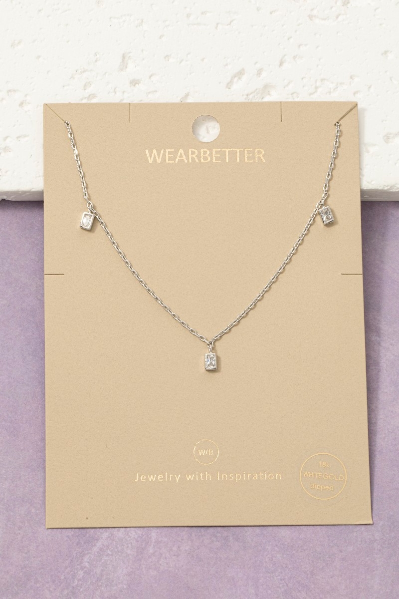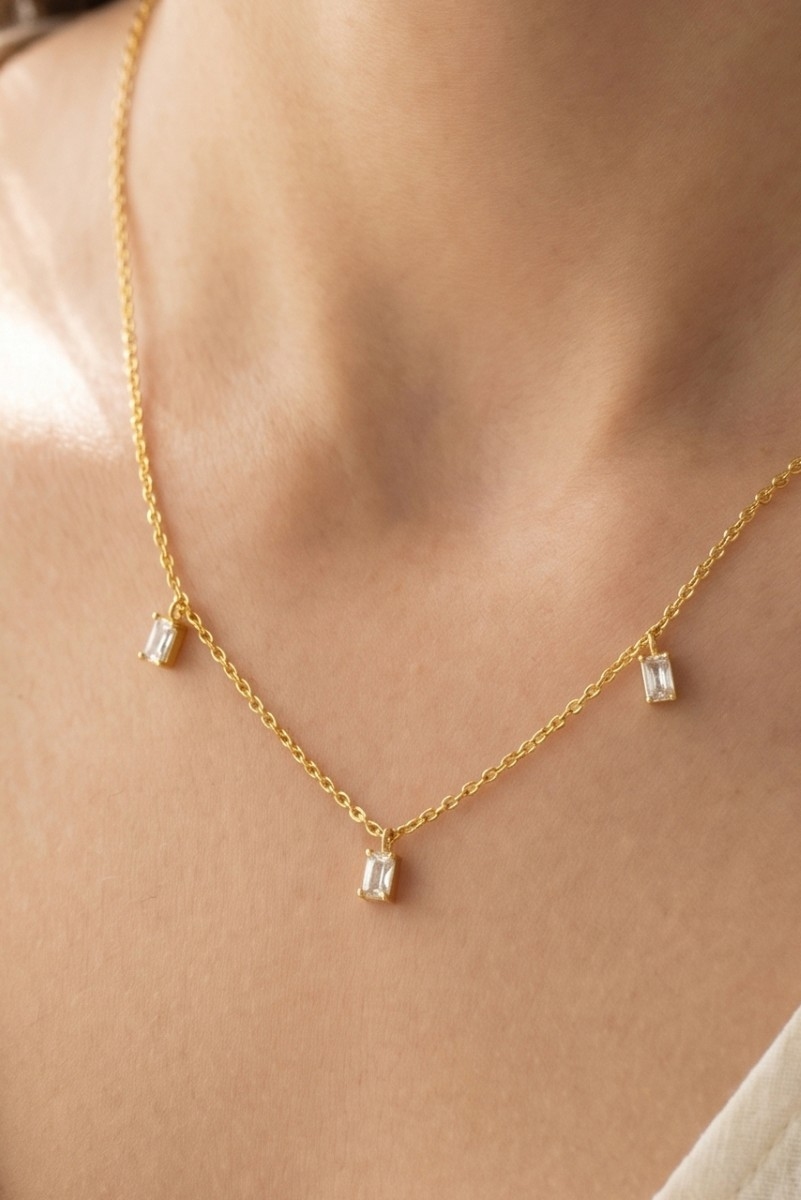• This necklace brings a luxurious dainty triple baguette cubic zirconia bezel drop station style. Immerse yourself in the world of understated glamour as this necklace effortlessly exudes timeless appeal.