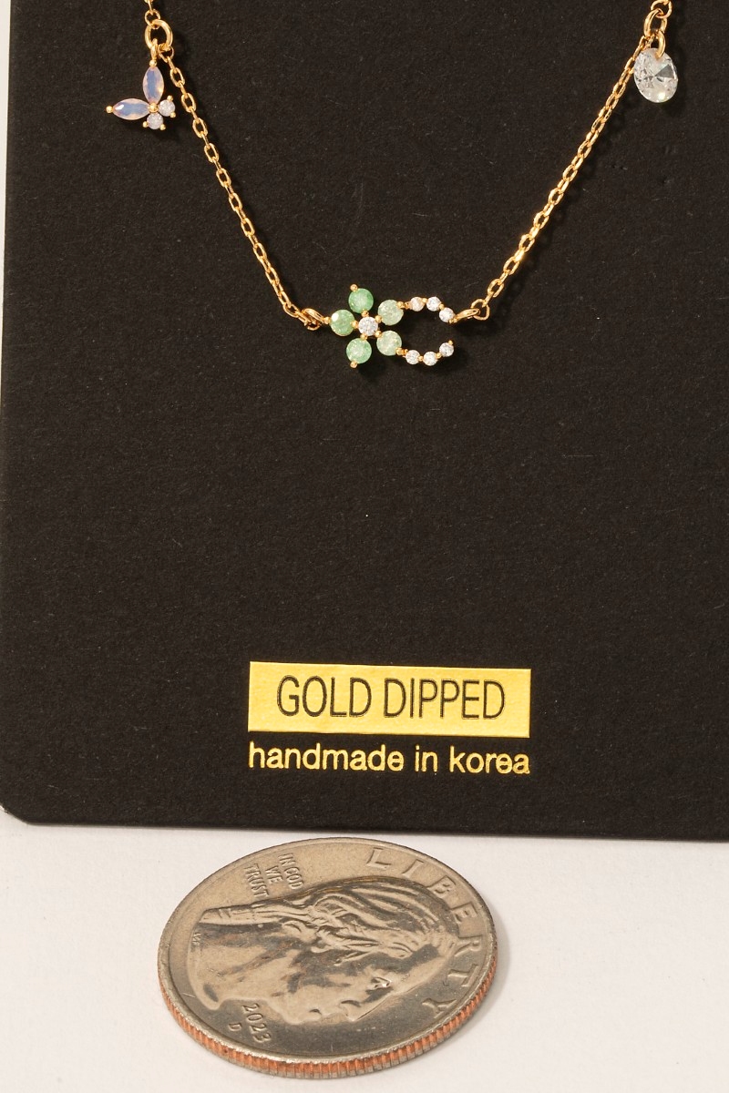 • This chain necklace displays a fashionable gold dipped cubic zirconia and butterfly charms style. Elevate your ensemble with this chain necklace that effortlessly captures the essence of refined fashion.