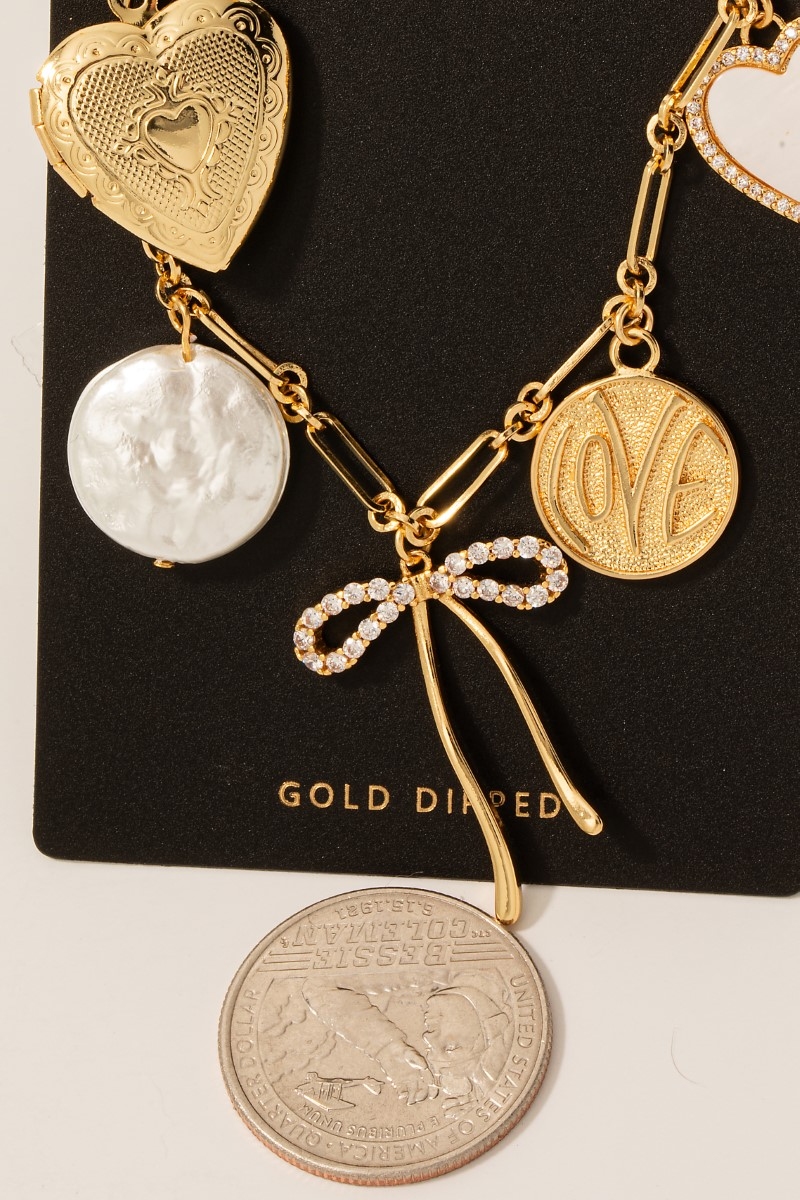 - this columbus jewelry necklace features a fashionable gold dipped heart ribbon and pearl coin charms style. Savor the allure of detailed craftsmanship in this exquisite necklace.