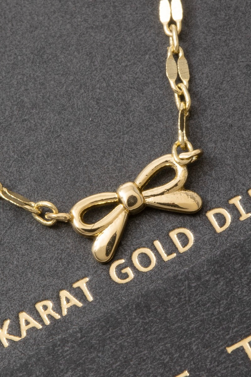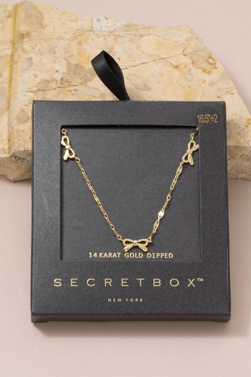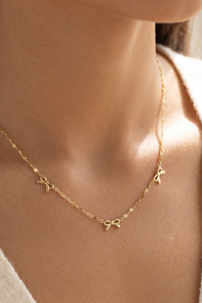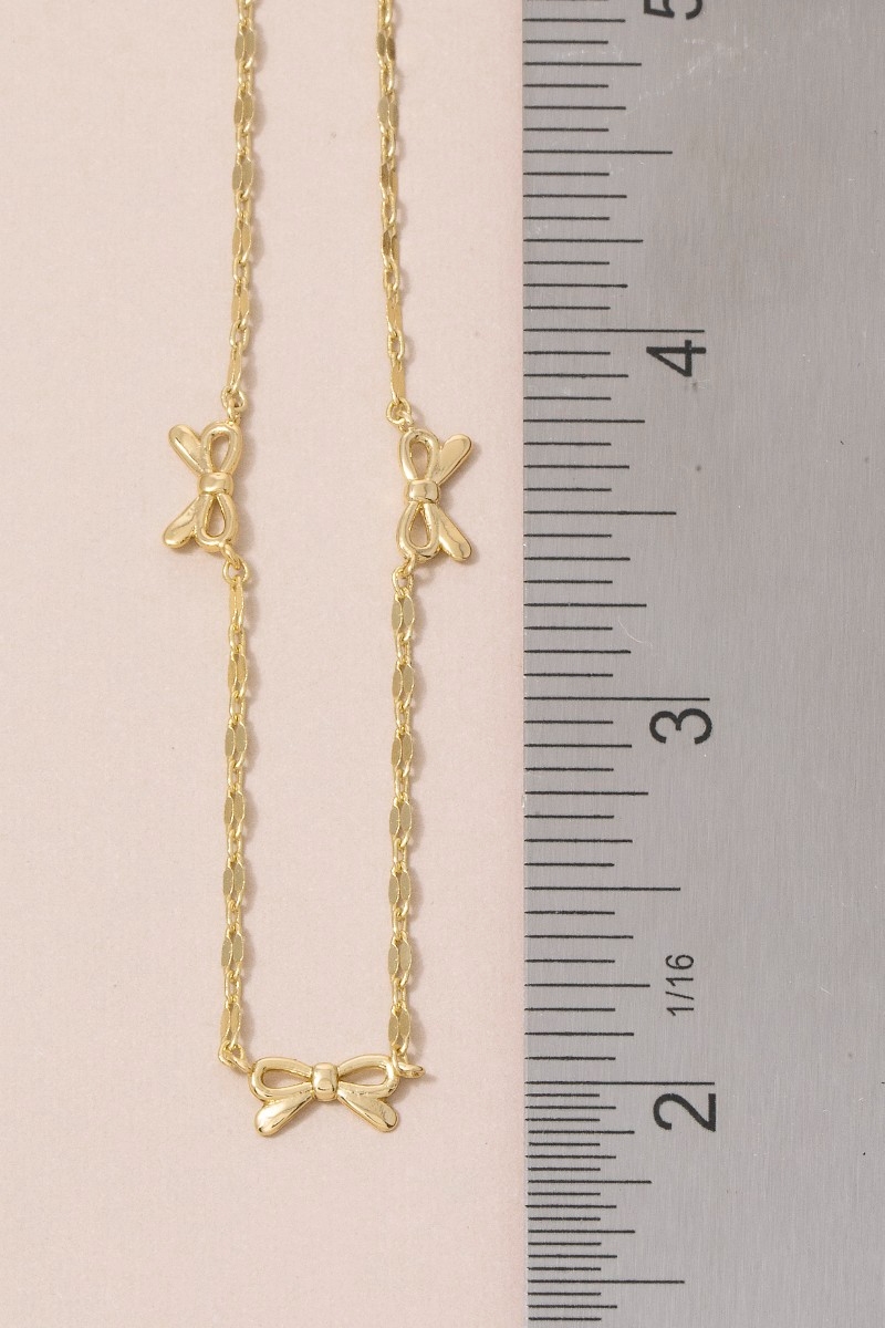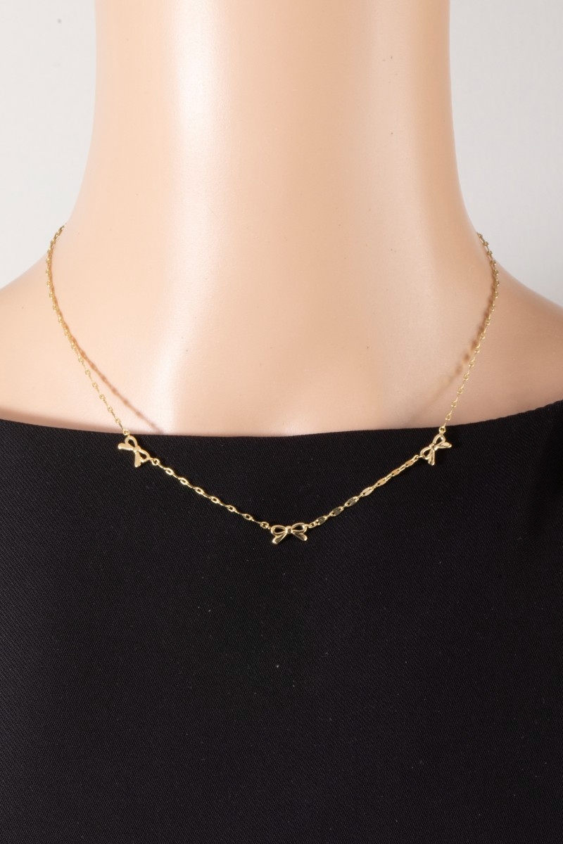 - This necklace introduces a stunning 14k gold dipped triple bow station style. Indulge in the allure of exquisite craftsmanship as this necklace effortlessly adds a touch of luxury to your attire.