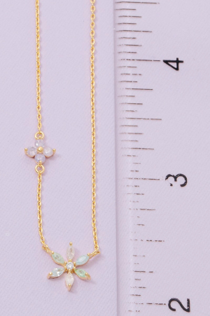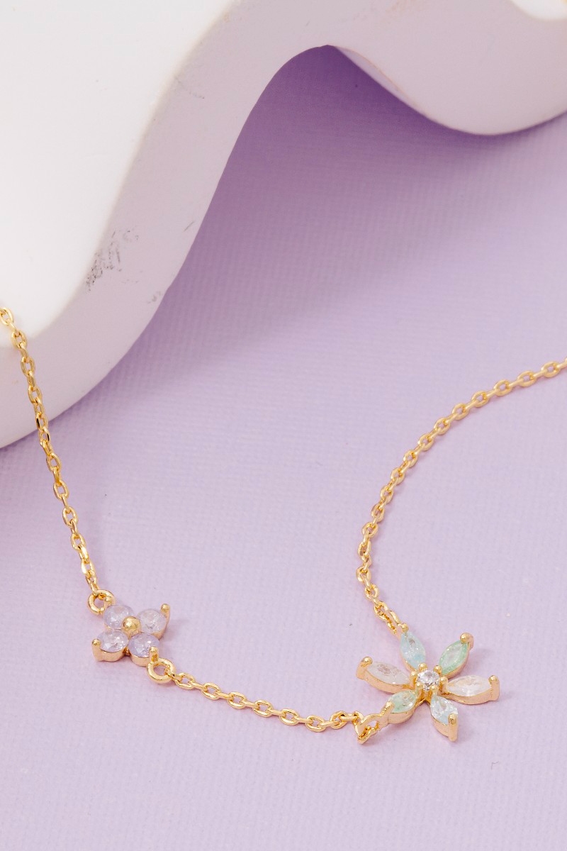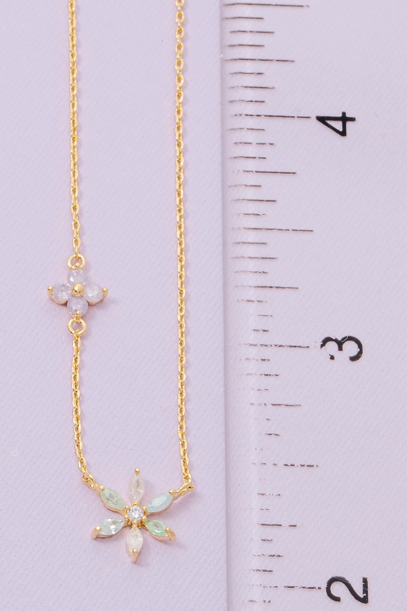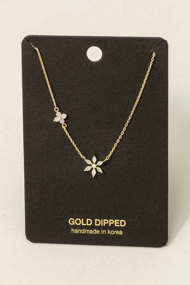 • This necklace adds a modern gold dipped double flower cubic zirconia charm style. Experience a subtle blend of modernity and classic charm as this necklace effortlessly adorns your ensemble.