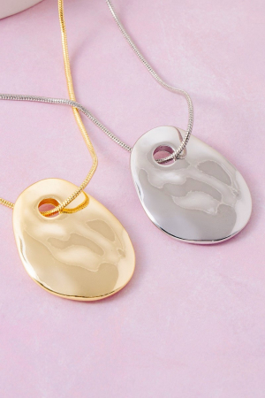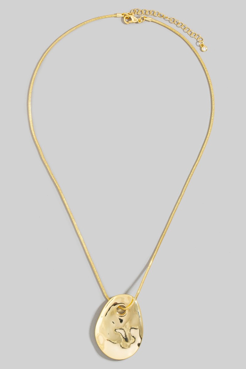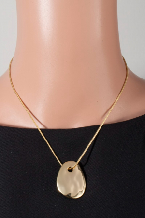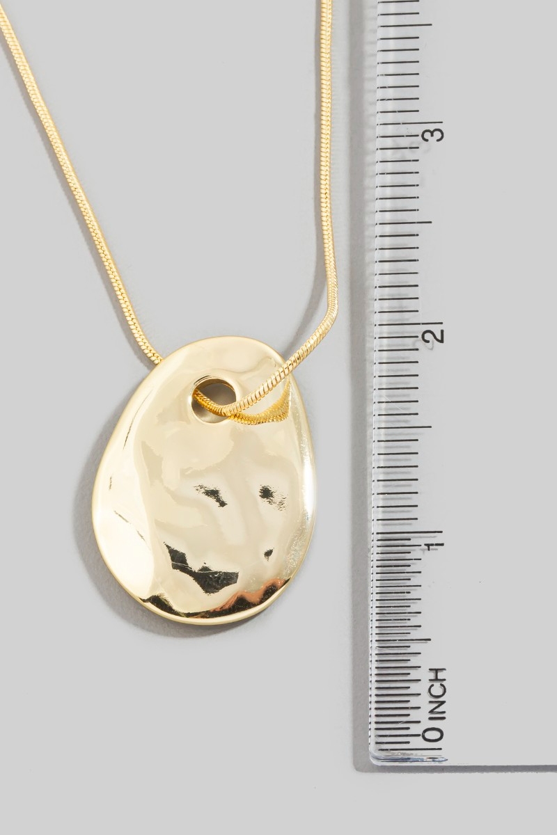 • This pendant necklace features a fashionable gold dipped hammered flat tear style. Revel in the intricate design that effortlessly distinguishes this pendant necklace, making it a statement piece.