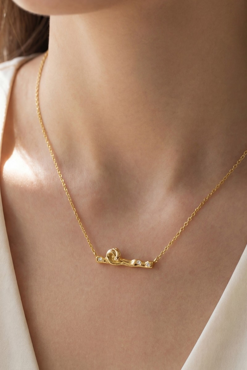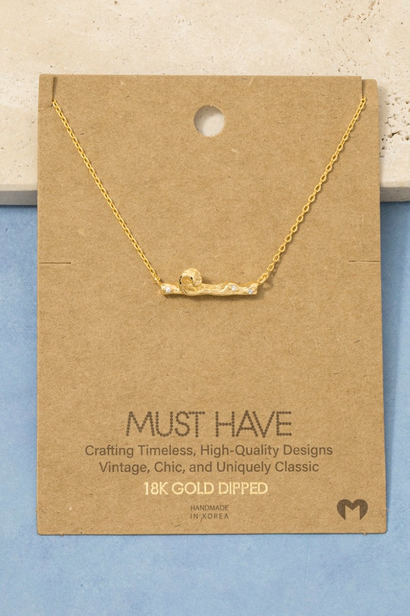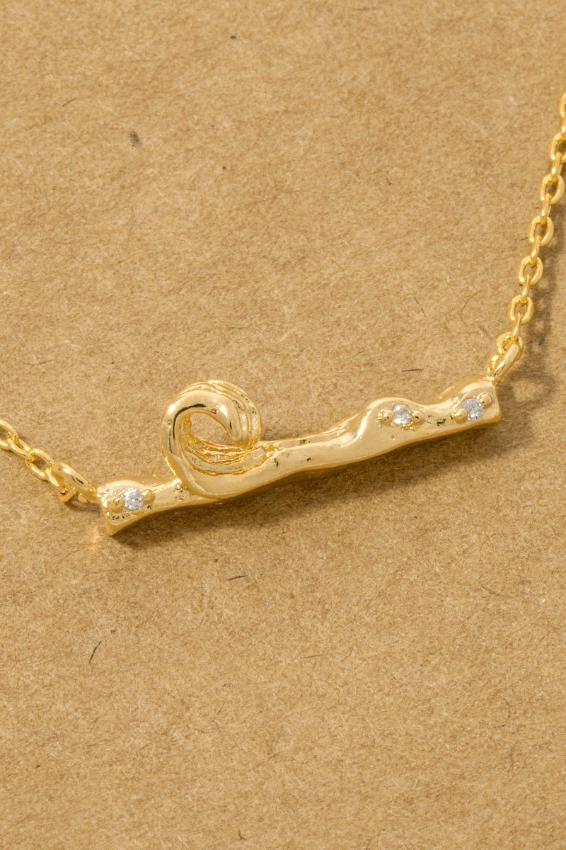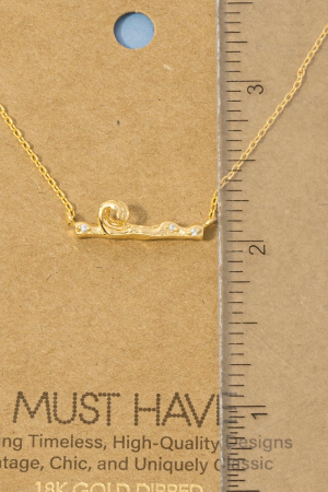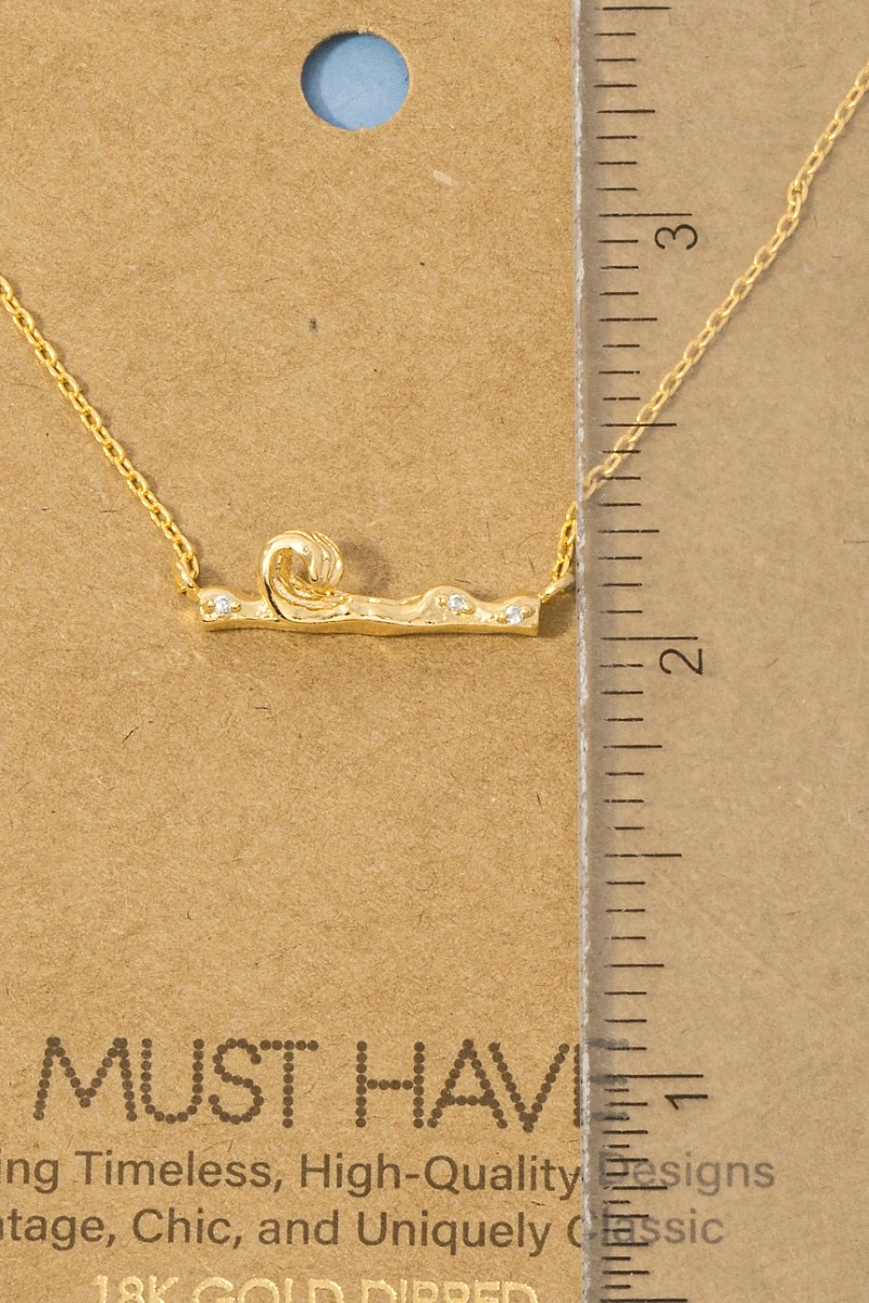 • This pendant necklace introduces a stunning gold dipped mini cubic zirconia studs wave bar style. Elevate your ensemble with this pendant necklace that effortlessly captures the essence of refined fashion.