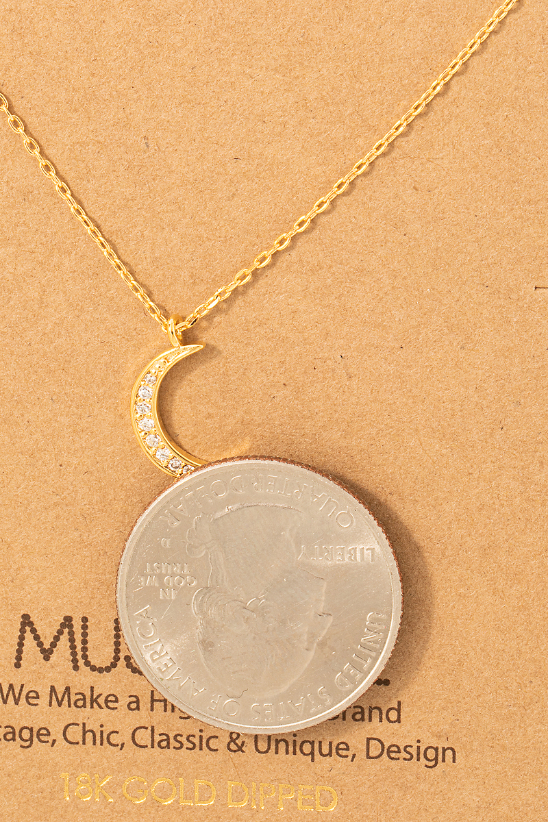 • This necklace displays a vibrant gold dipped pave crescent moon pendant dainty style. Immerse yourself in the world of understated glamour as this necklace effortlessly exudes timeless appeal.