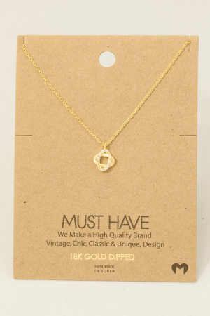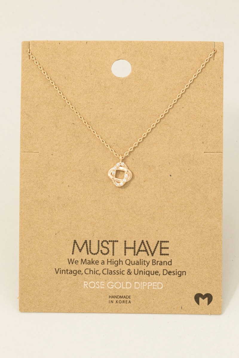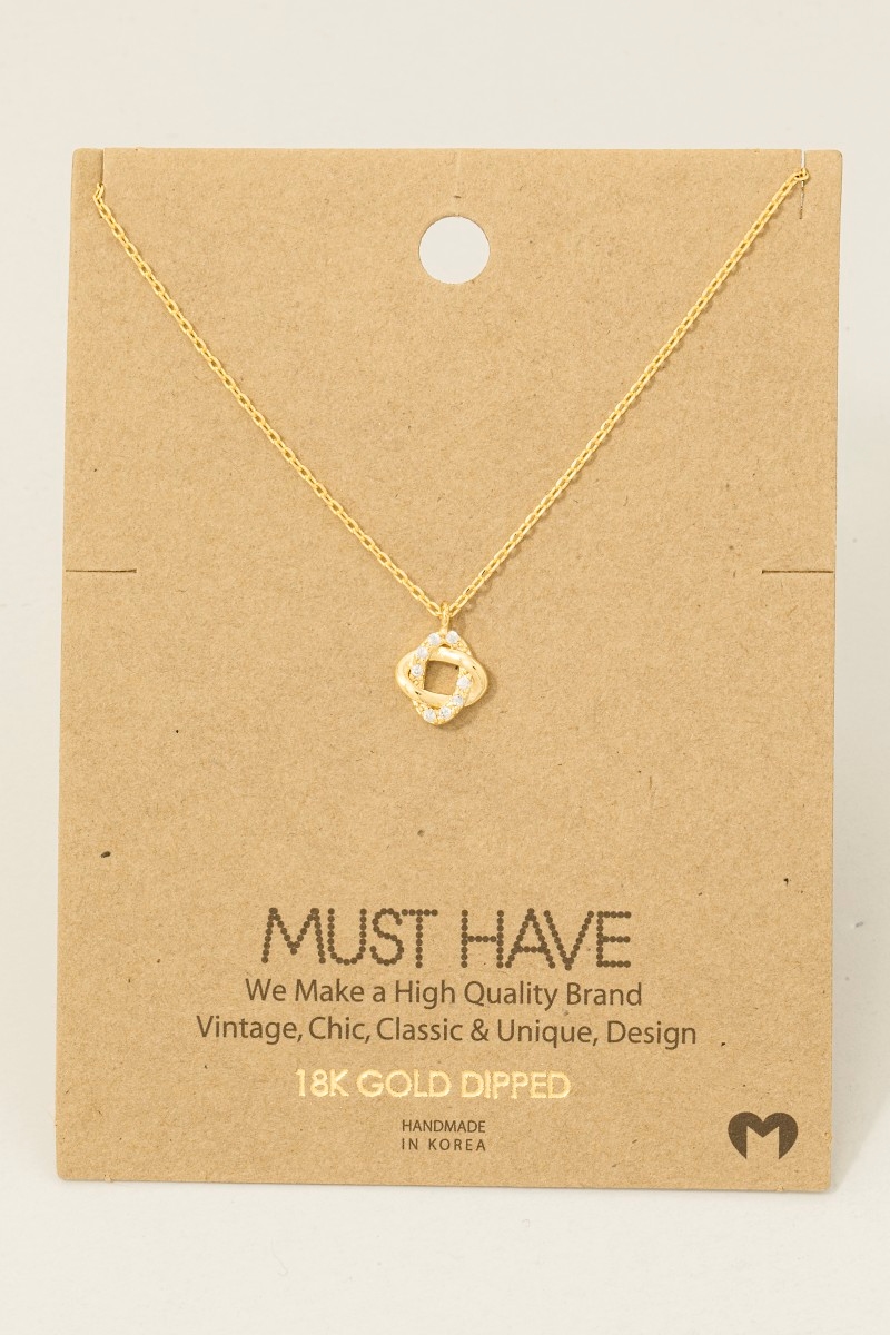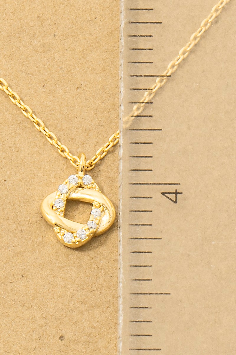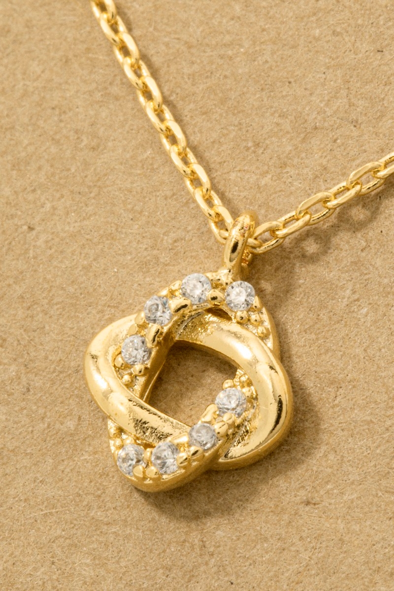 • This trending necklace displays a vibrant gold dipped pave double knot pendant necklace style. Explore a refined sense of style with this trending necklace, seamlessly elevating the chic factor of your look.