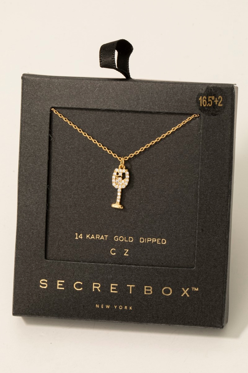 • This necklace showcases a timeless gold dipped secret box wine glass style. Embark on a journey of sartorial refinement as this necklace effortlessly complements your fashion sense.