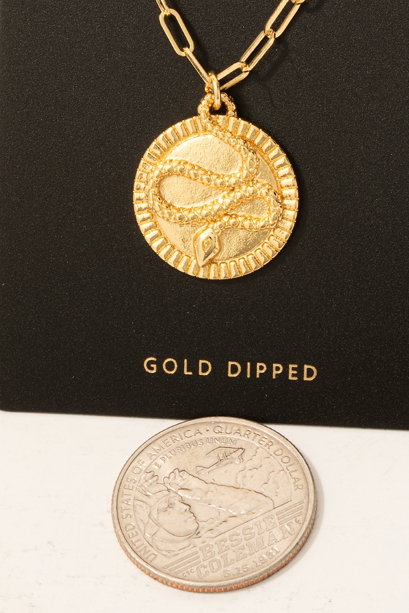 • this columbus jewelry necklace adds a modern gold dipped snake coin pendant style. Delight in the intricate details that make this columbus jewelry necklace an essential element in expressing your fashion identity.