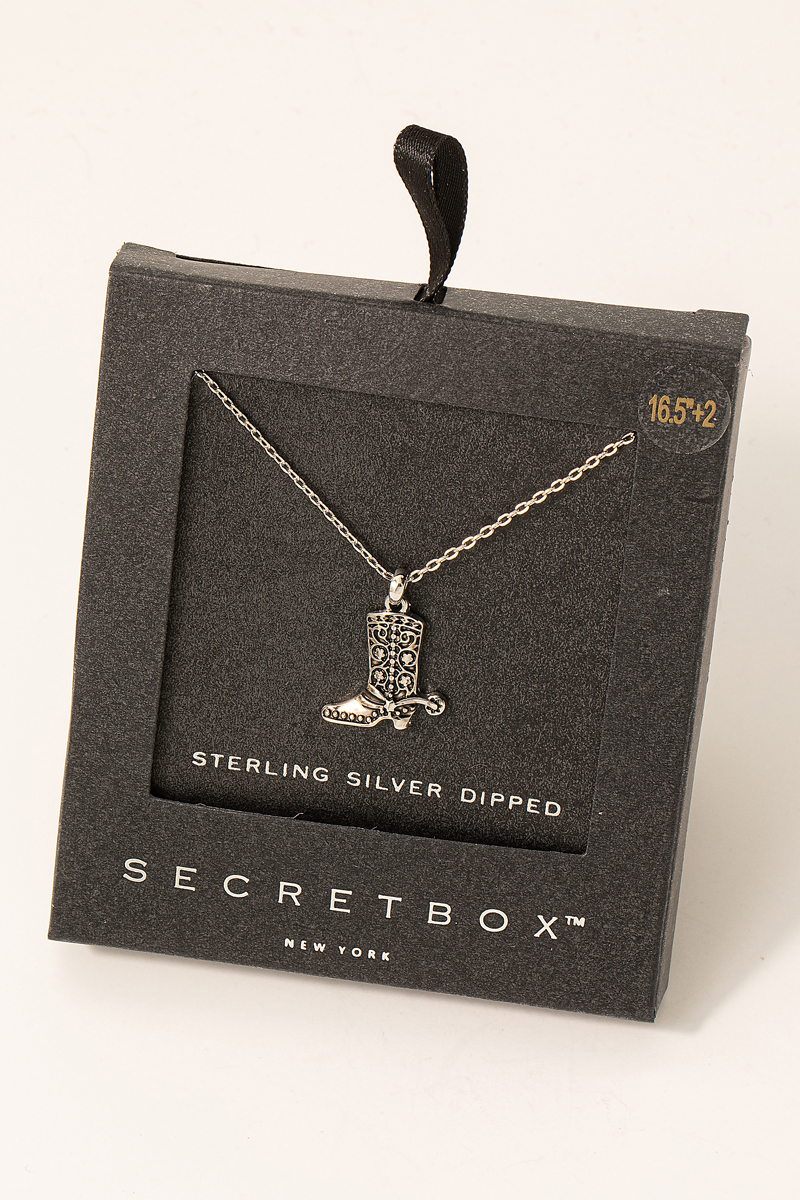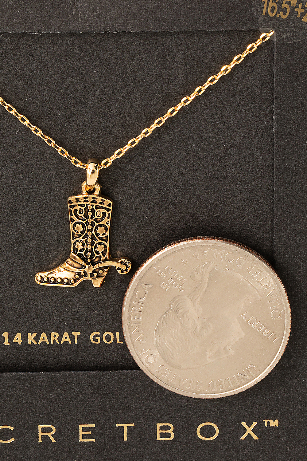 • This gold dipped necklace adds a modern secret box cowboy boot pendant necklace style. Immerse yourself in the world of understated glamour as this gold dipped necklace effortlessly exudes timeless appeal.