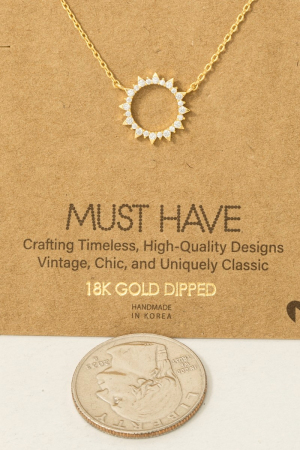 • This trending necklace features a fashionable gold dipped pave circle sun pendant necklace style. Delight in the intricate details that make this trending necklace an essential element in expressing your fashion identity.