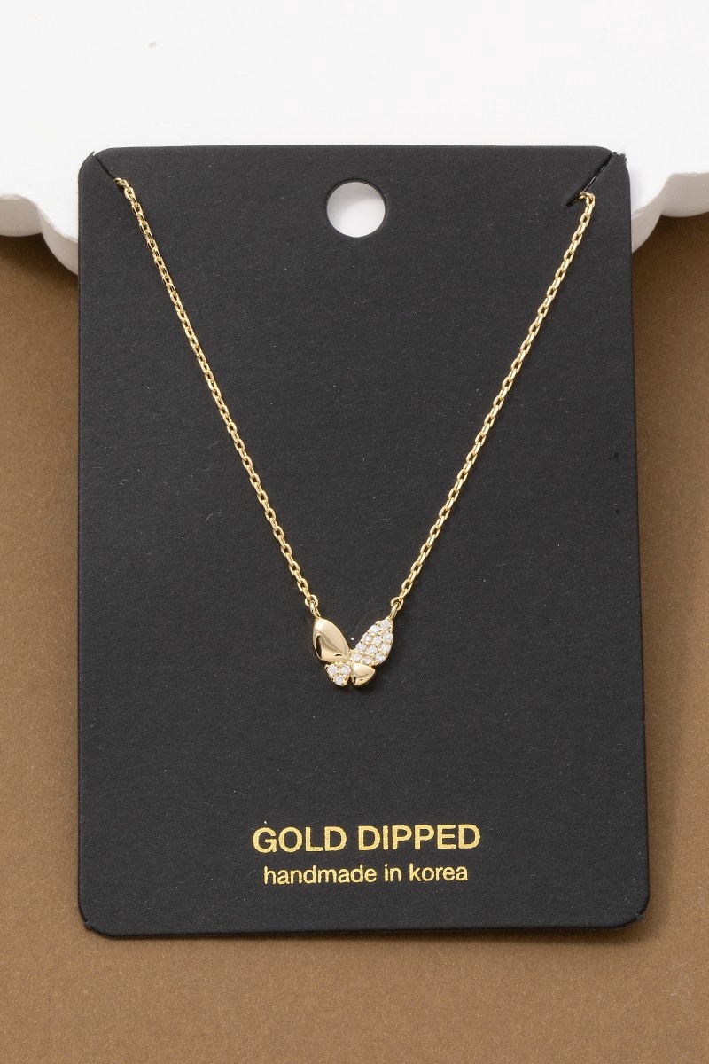 - This pendant necklace brings a luxurious gold dipped pave cubic zirconia butterfly style. Unveil a new dimension of sophistication as this pendant necklace effortlessly enhances the elegance of your ensemble.