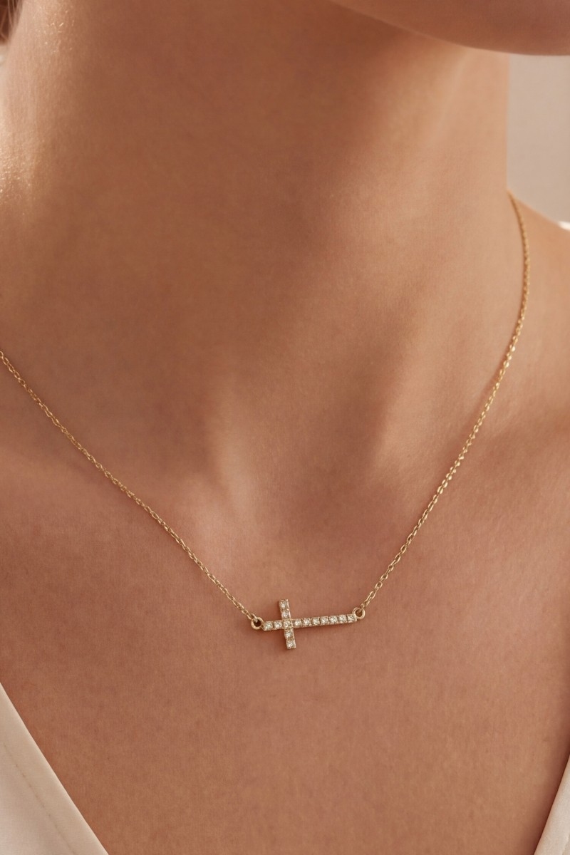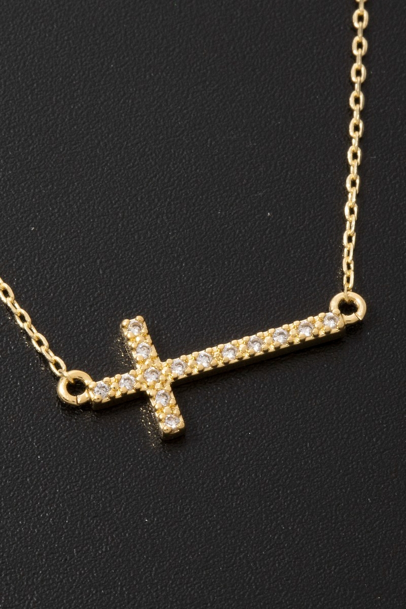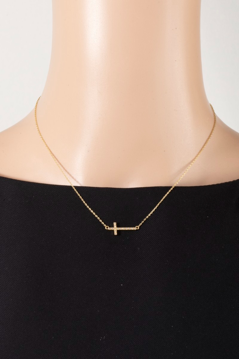 • This pendant necklace introduces a unique gold dipped pave thin cross style. Immerse yourself in the world of understated glamour as this pendant necklace effortlessly exudes timeless appeal.