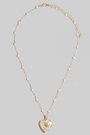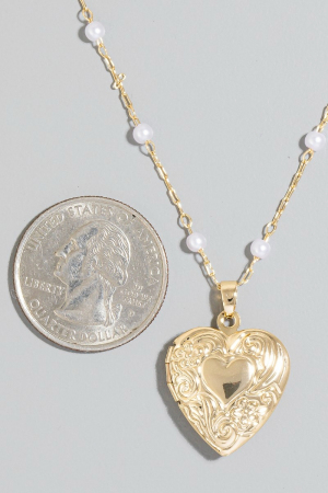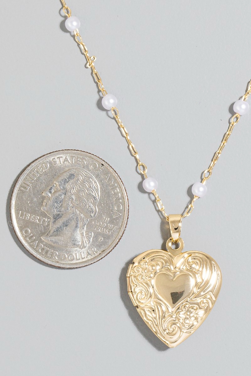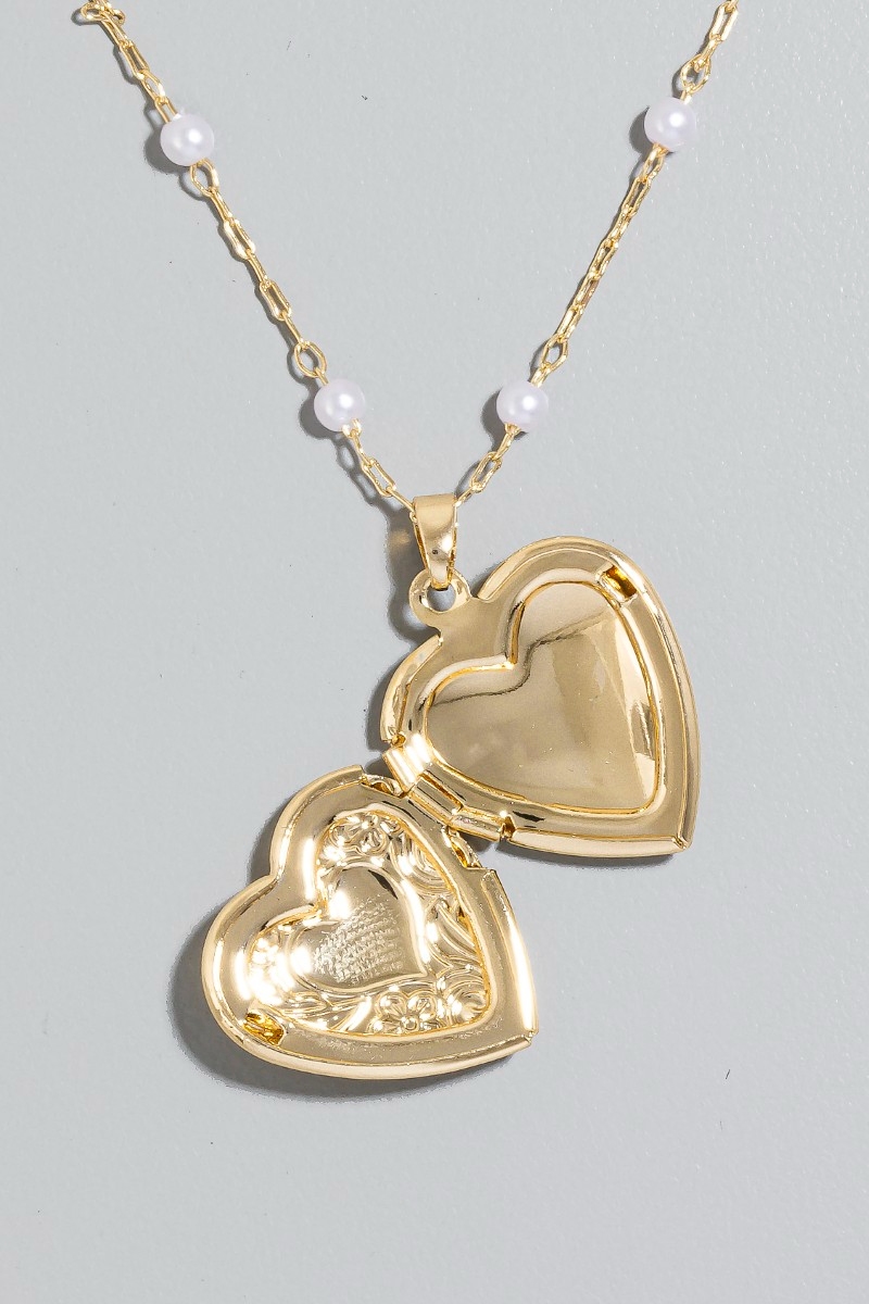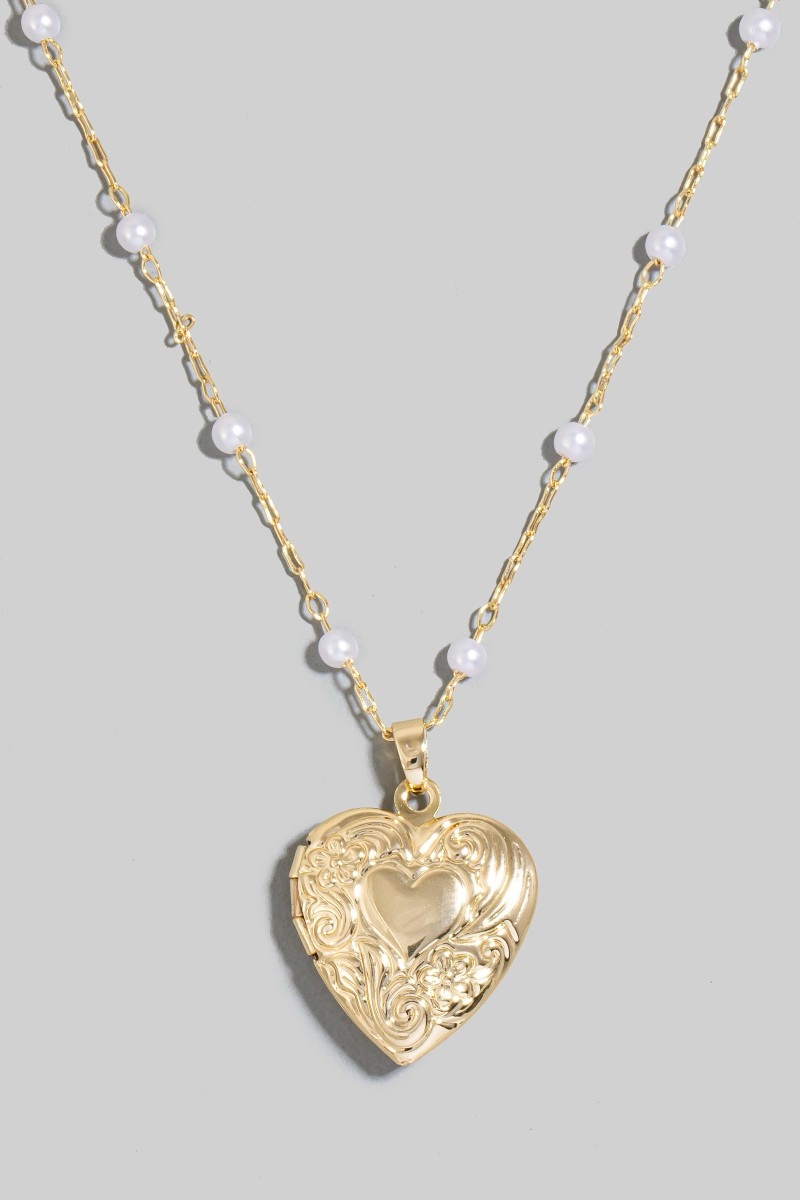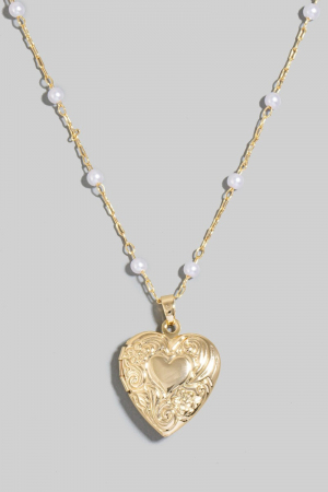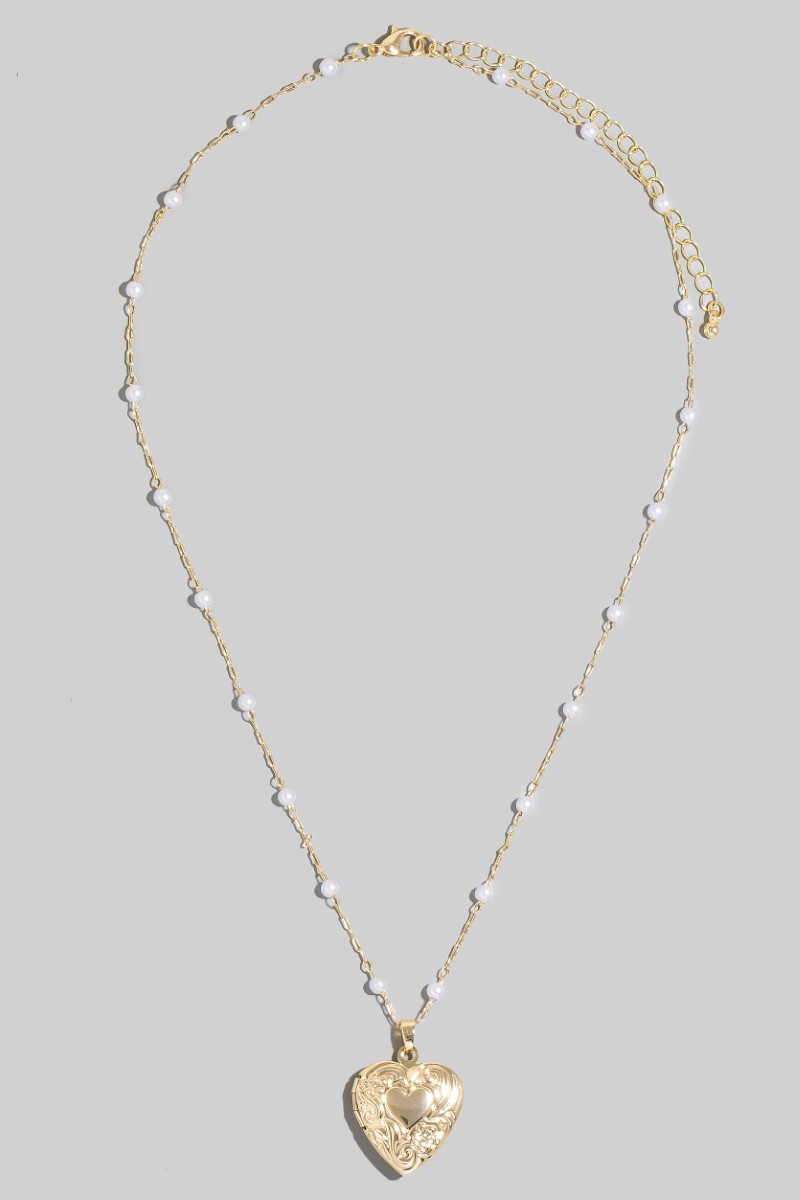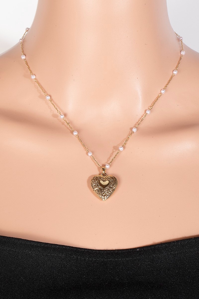 - This chain necklace brings a luxurious intricate heart locket pearl beads style. Embark on a journey of sartorial refinement as this chain necklace effortlessly complements your fashion sense.