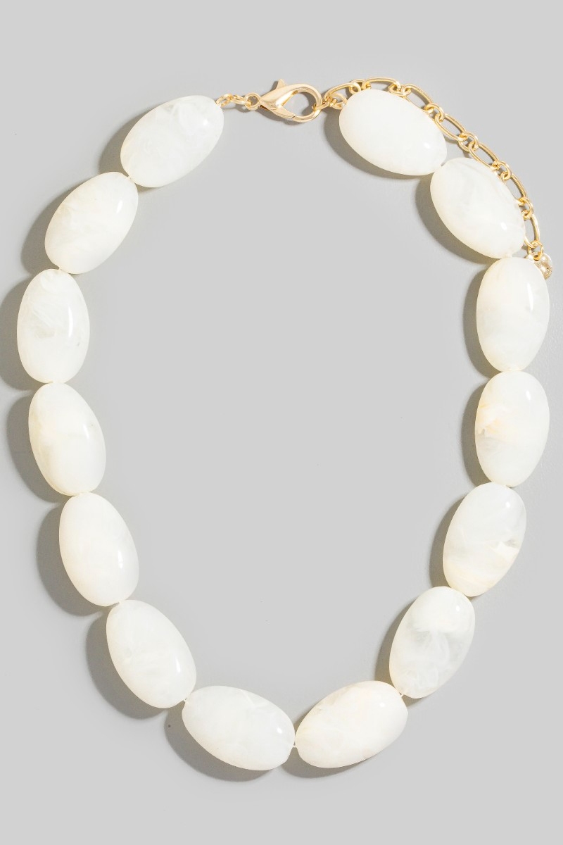 • This necklace showcases a unique large oval marble resin beads style. Experience a subtle blend of modernity and classic charm as this necklace effortlessly adorns your ensemble.