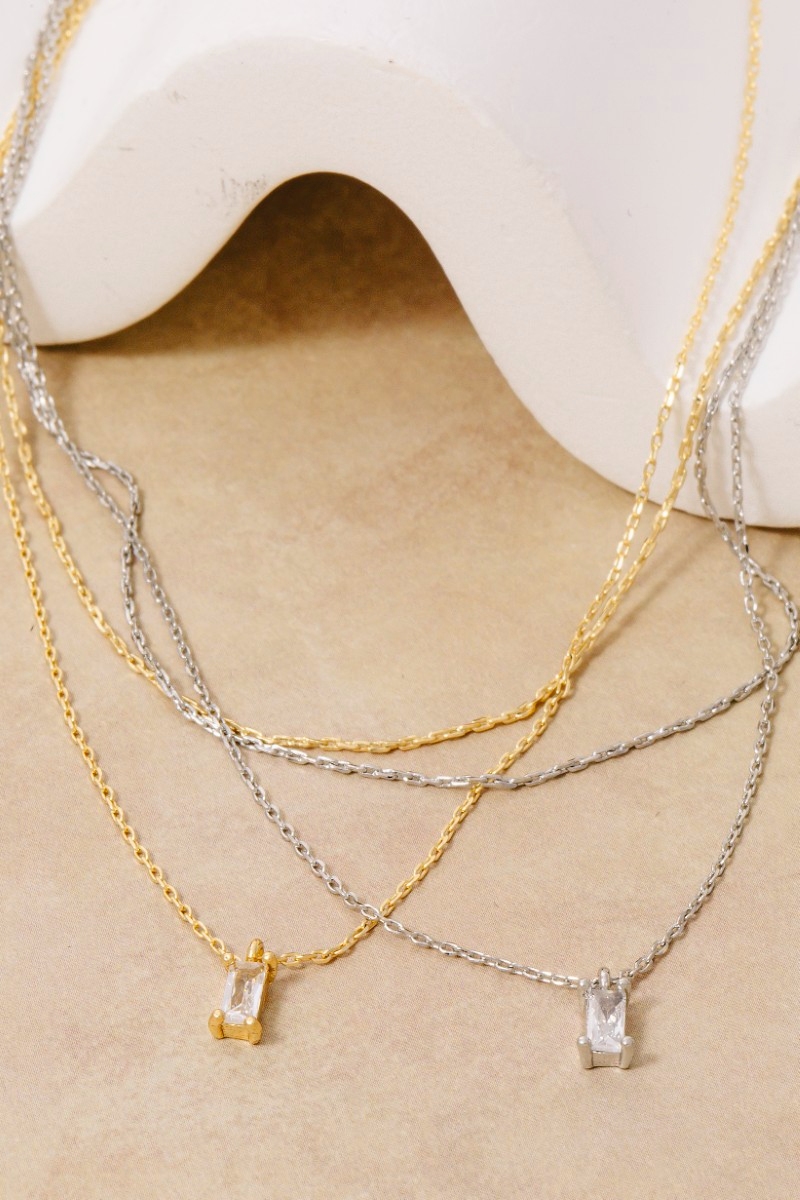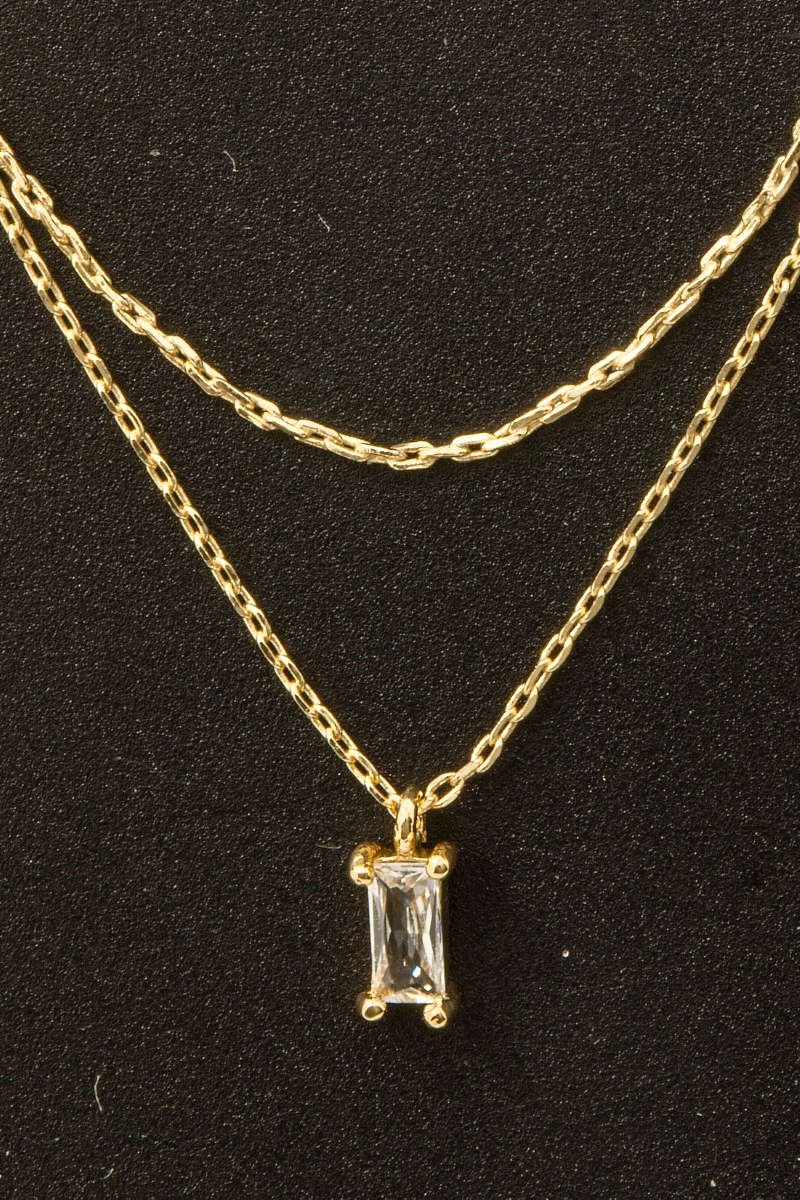• this columbus jewelry necklace adds a modern gold dipped cubic zirconia baguette layered dainty style. Experience a subtle blend of modernity and classic charm as this columbus jewelry necklace effortlessly adorns your ensemble.
