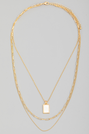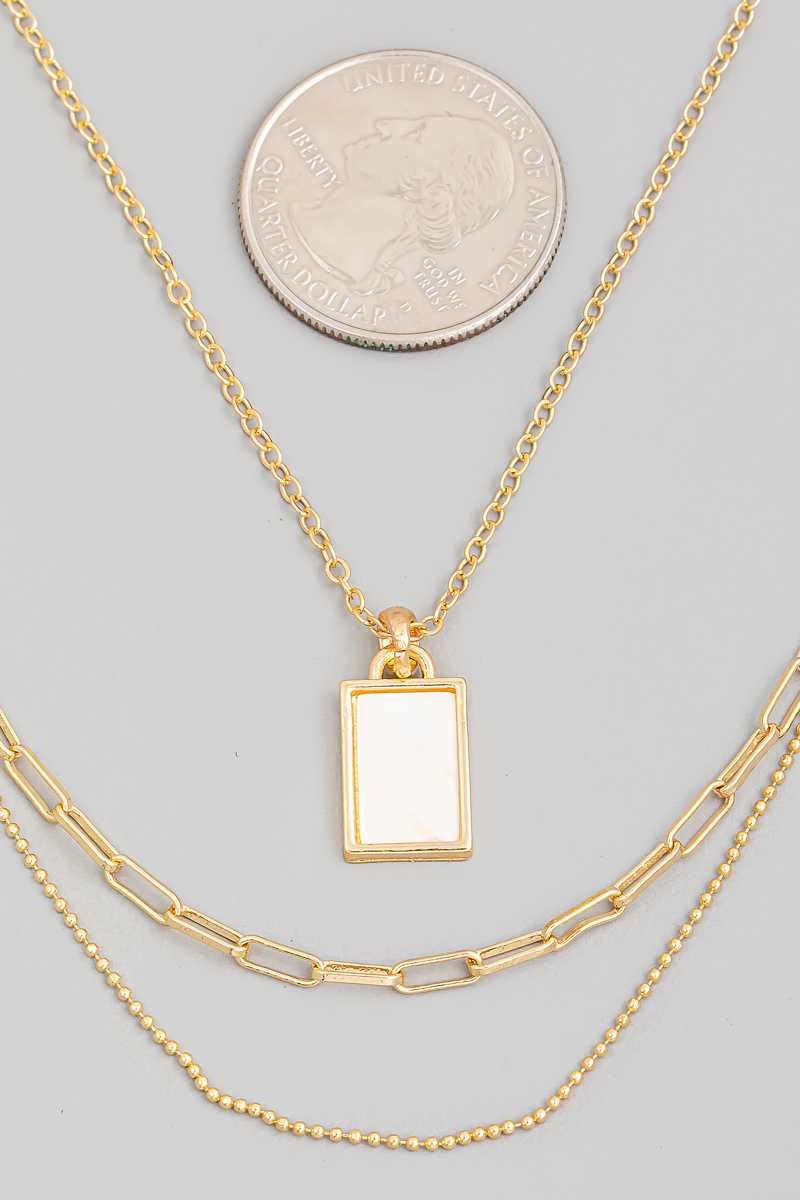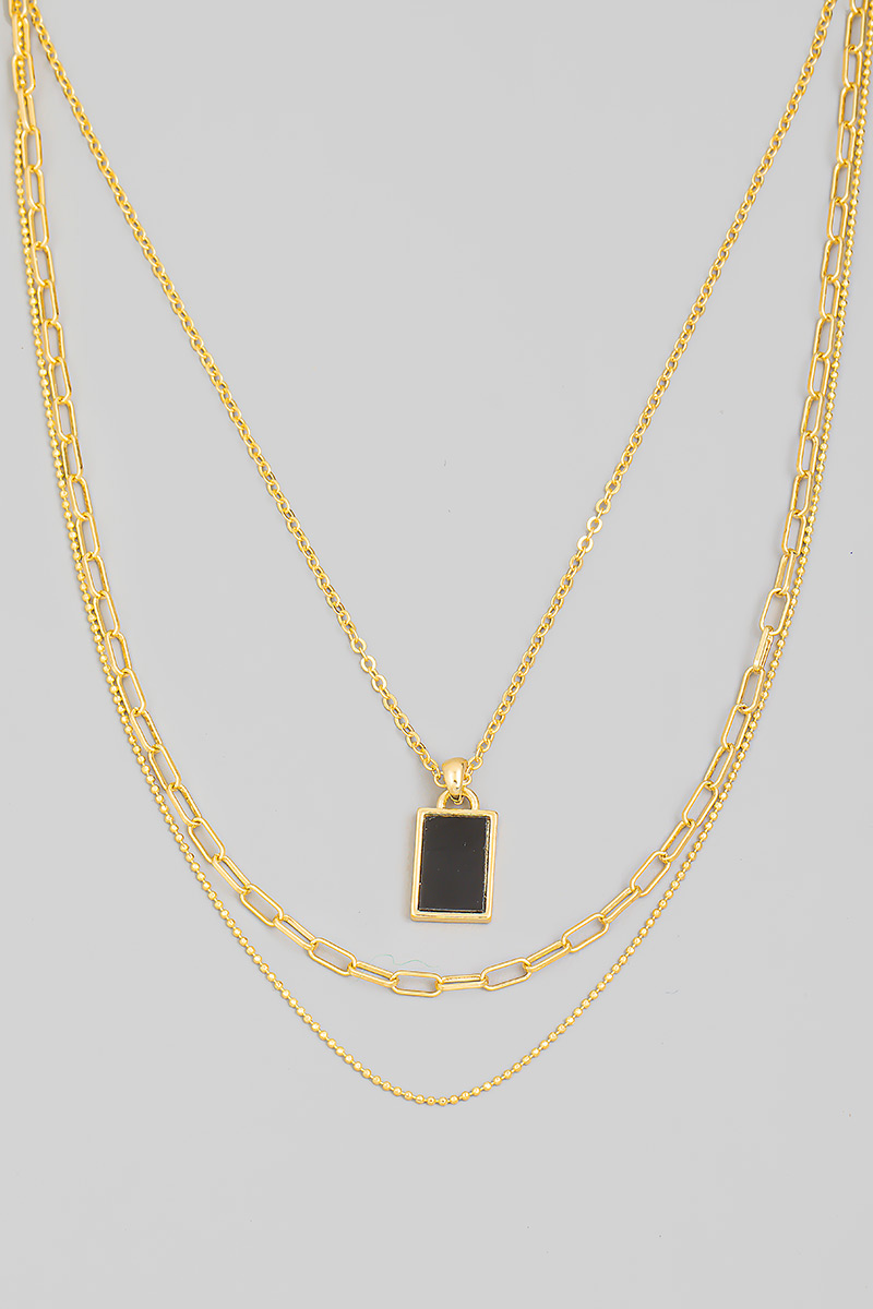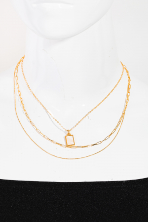 • This necklace showcases a unique layered chain link rectangle charm style. Indulge in the allure of exquisite craftsmanship as this necklace effortlessly adds a touch of luxury to your attire.