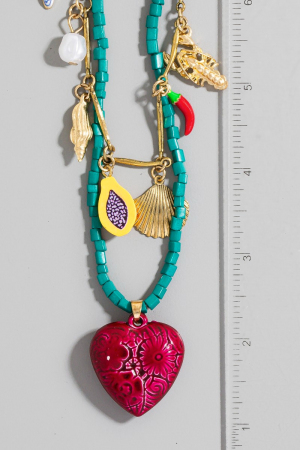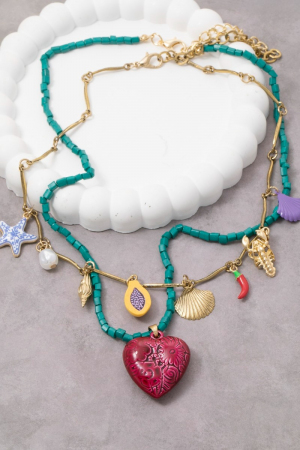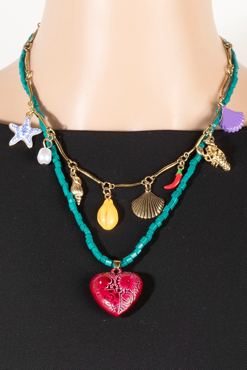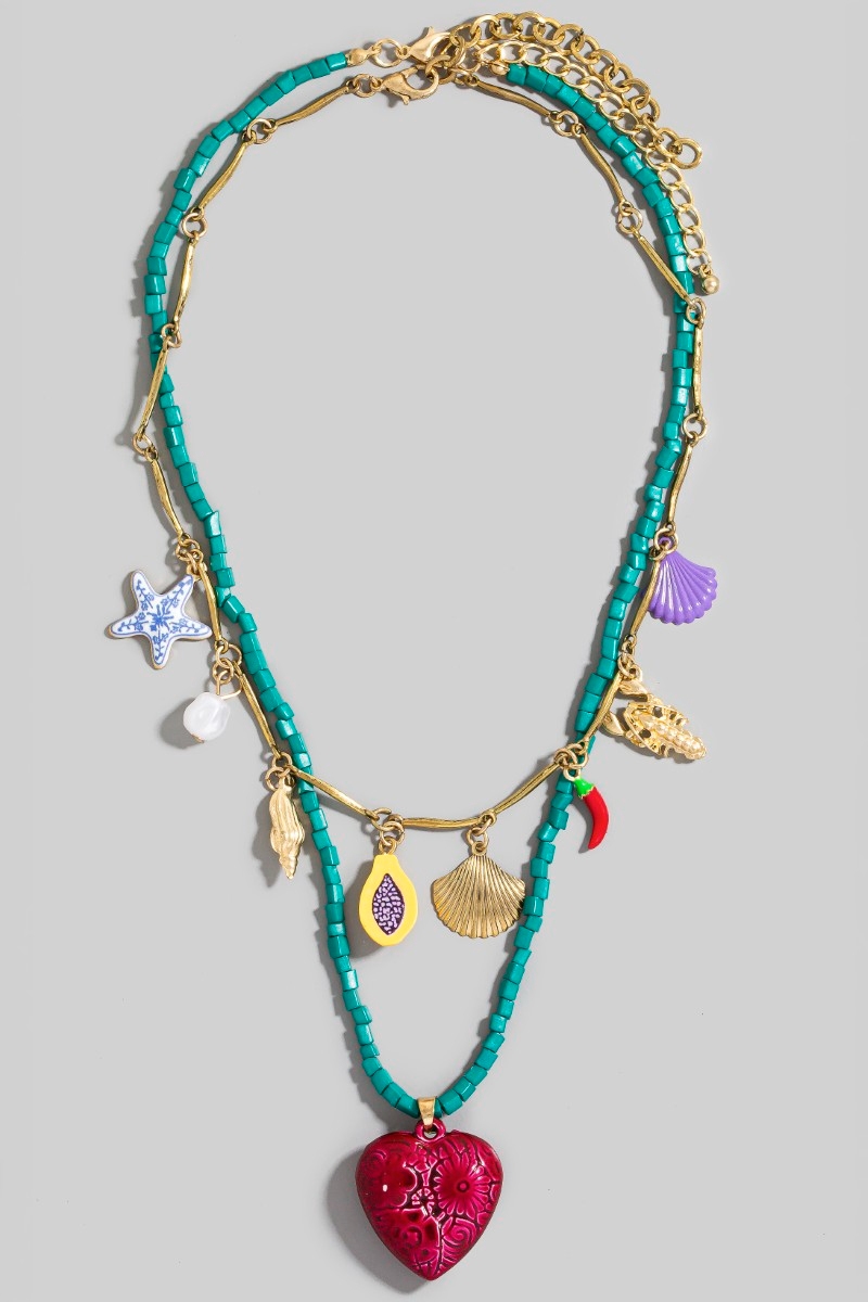 - This layered necklace introduces a unique sea life heart and fruit charms beaded and chain style. Experience a subtle blend of modernity and classic charm as this layered necklace effortlessly adorns your ensemble.