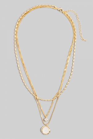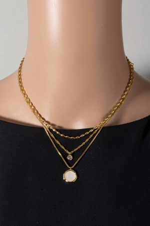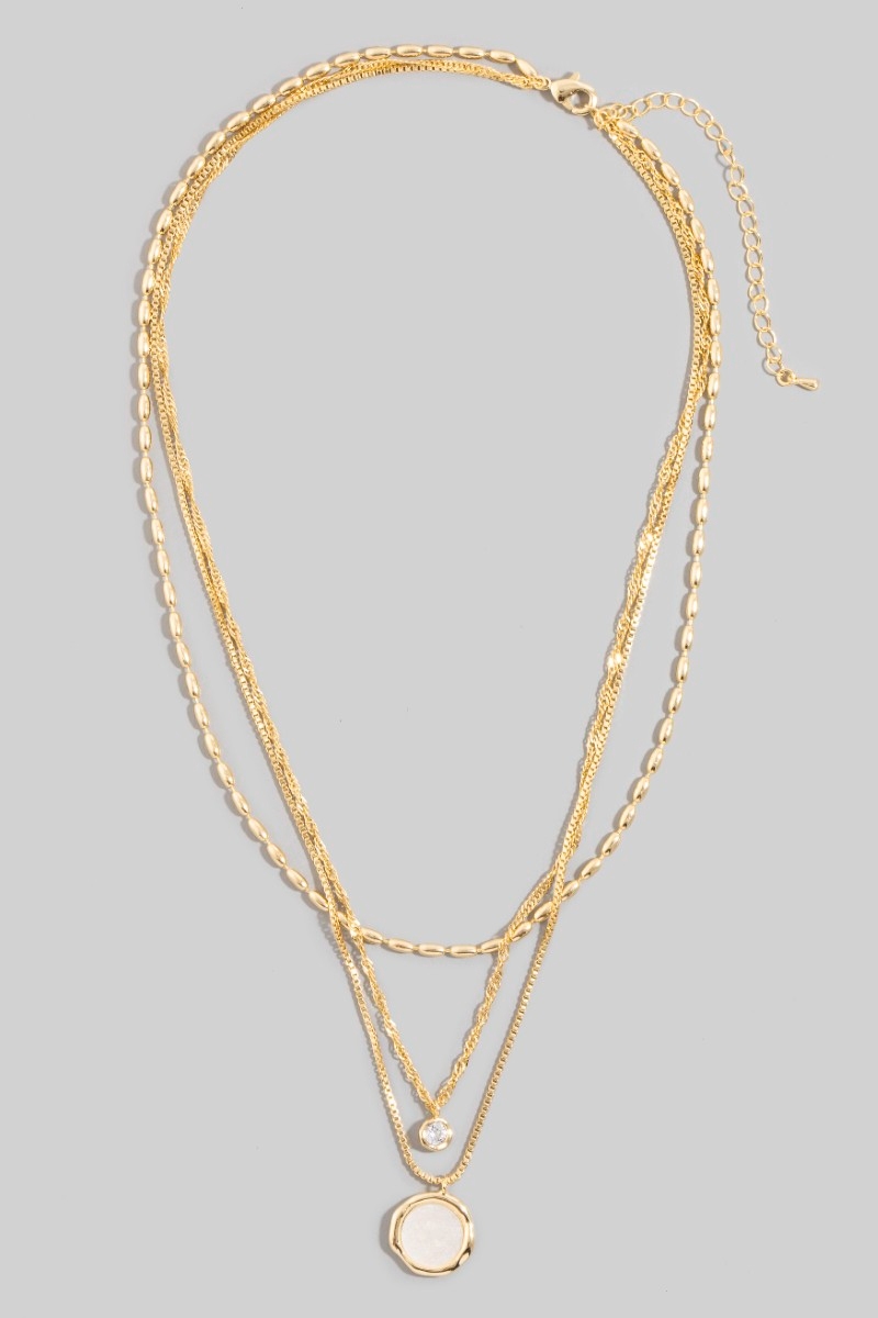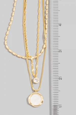 - This necklace introduces a stunning thee layered chain cubic zirconia charm style. Experience a subtle blend of modernity and classic charm as this necklace effortlessly adorns your ensemble.
