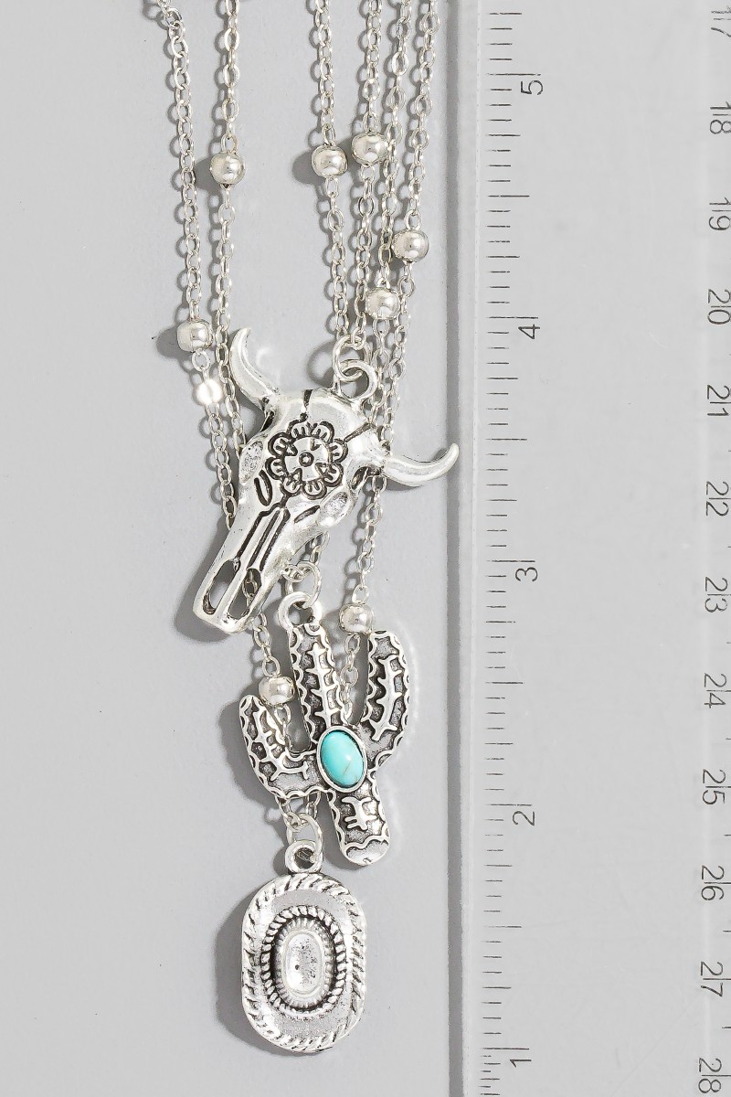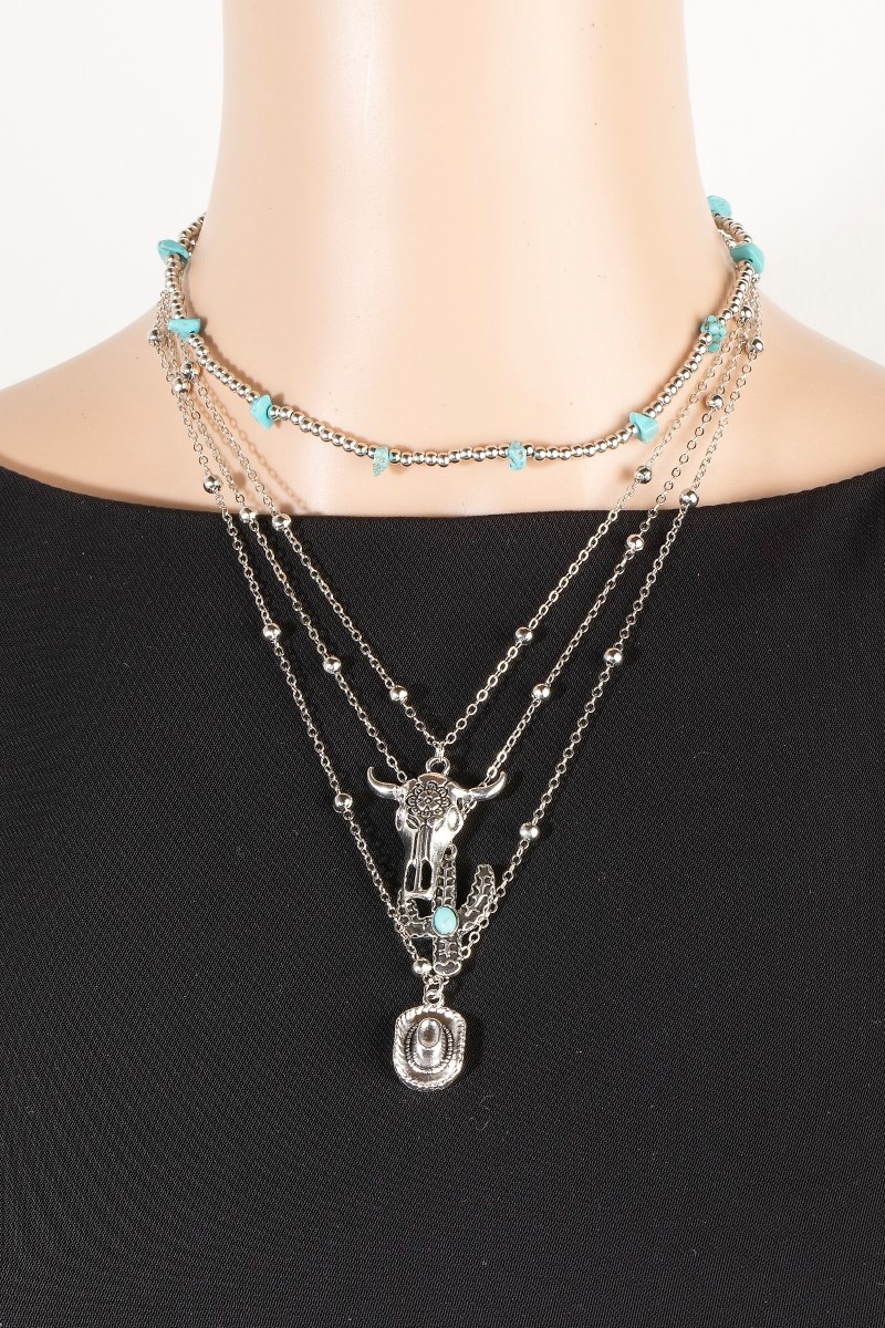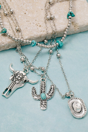 - This chain necklace introduces a unique turquoise chip stone western charms layered style. Delight in the nuanced details that make this chain necklace a testament to fine design and impeccable taste.