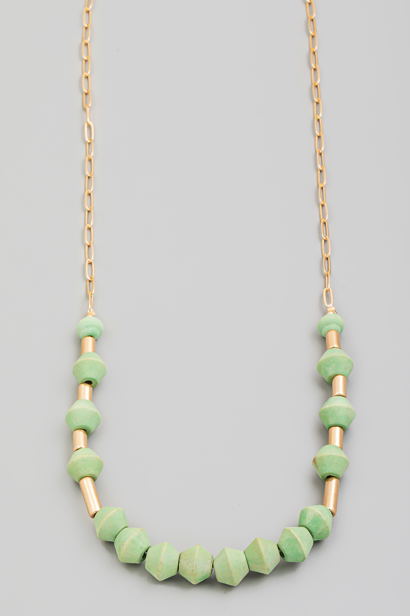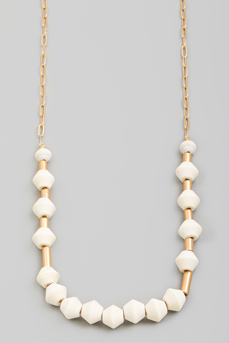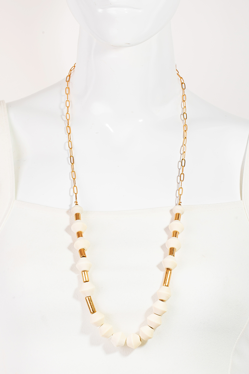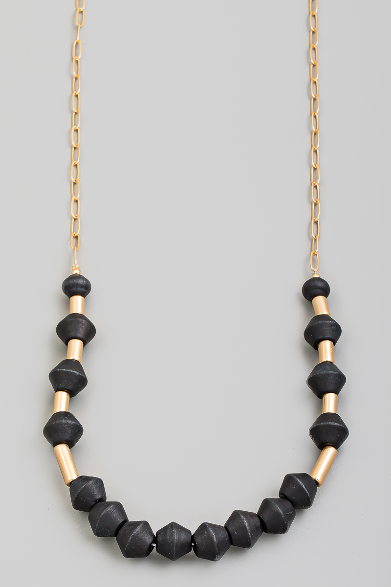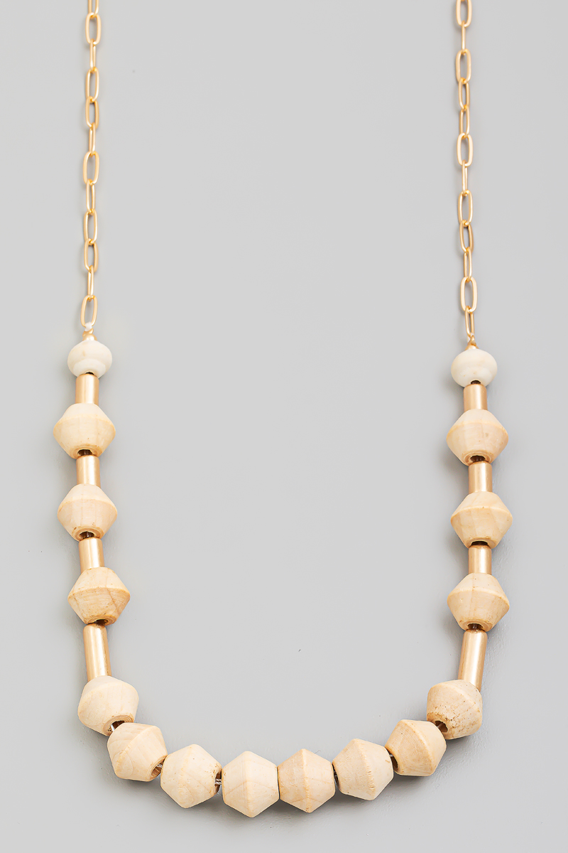 • This chain necklace showcases a unique wooden and metallic bead long style. Experience the joy of accessorizing with this piece that effortlessly combines versatility and charm.