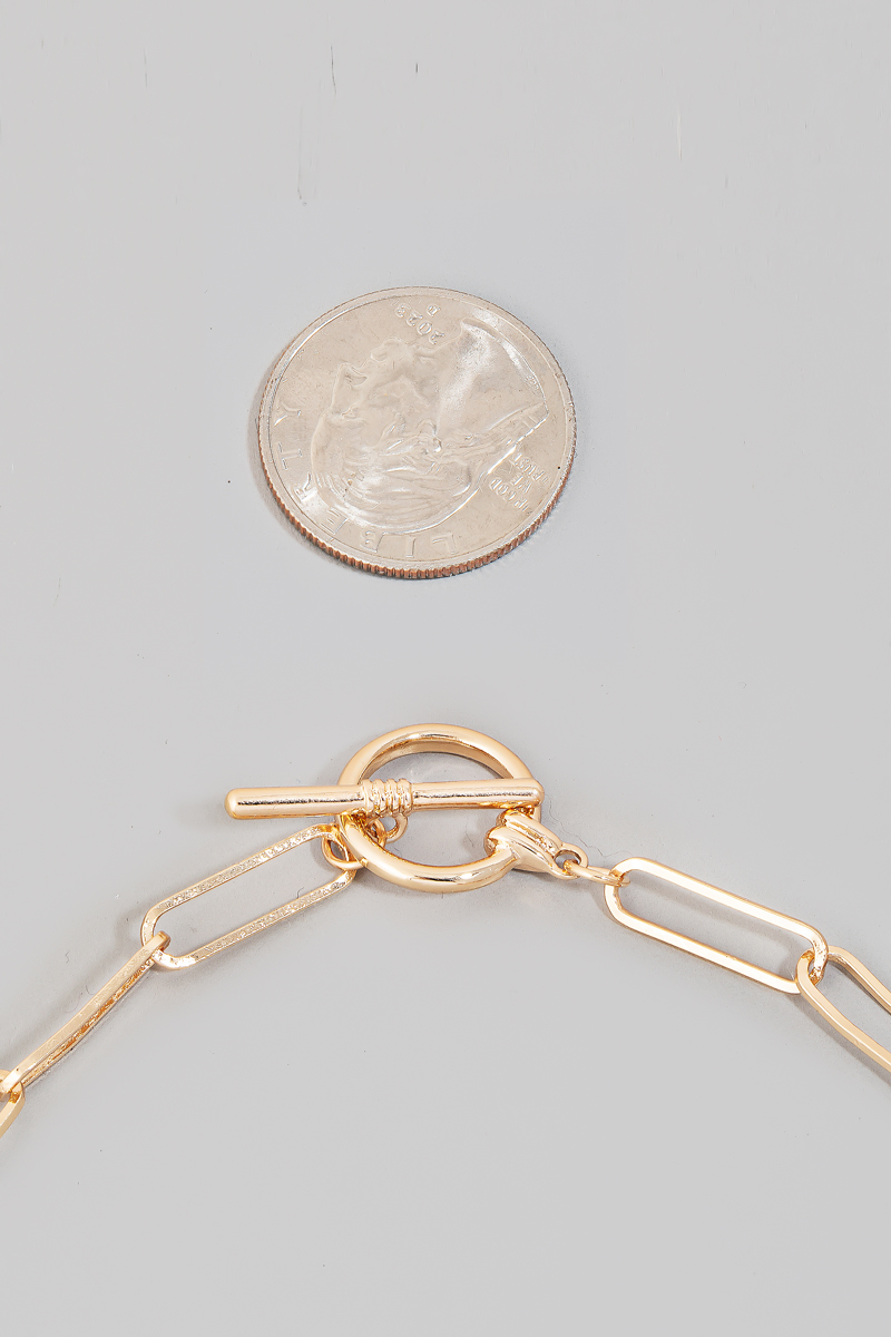 - This necklace brings a unique long metallic oval chain toggle style. Delight in the intricate details that make this accessory an essential element in expressing your fashion identity.