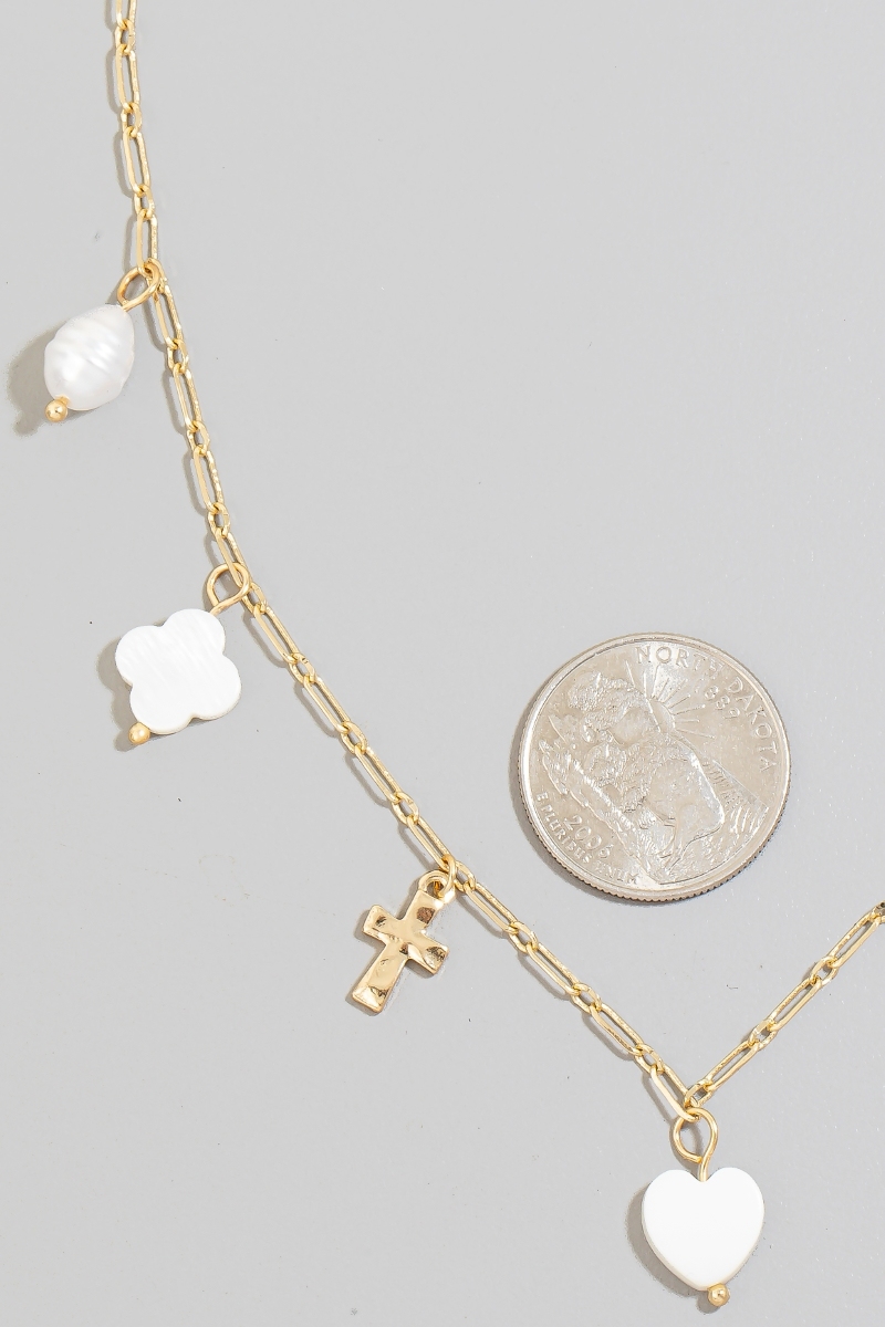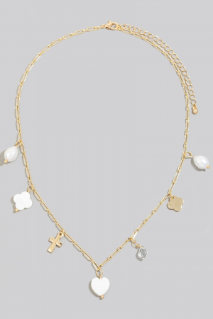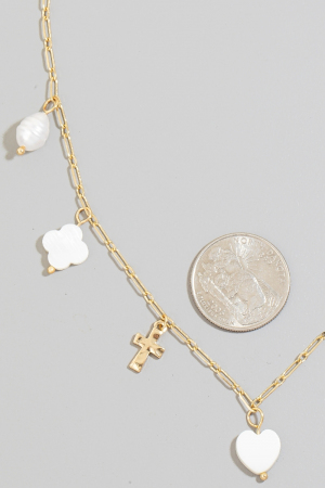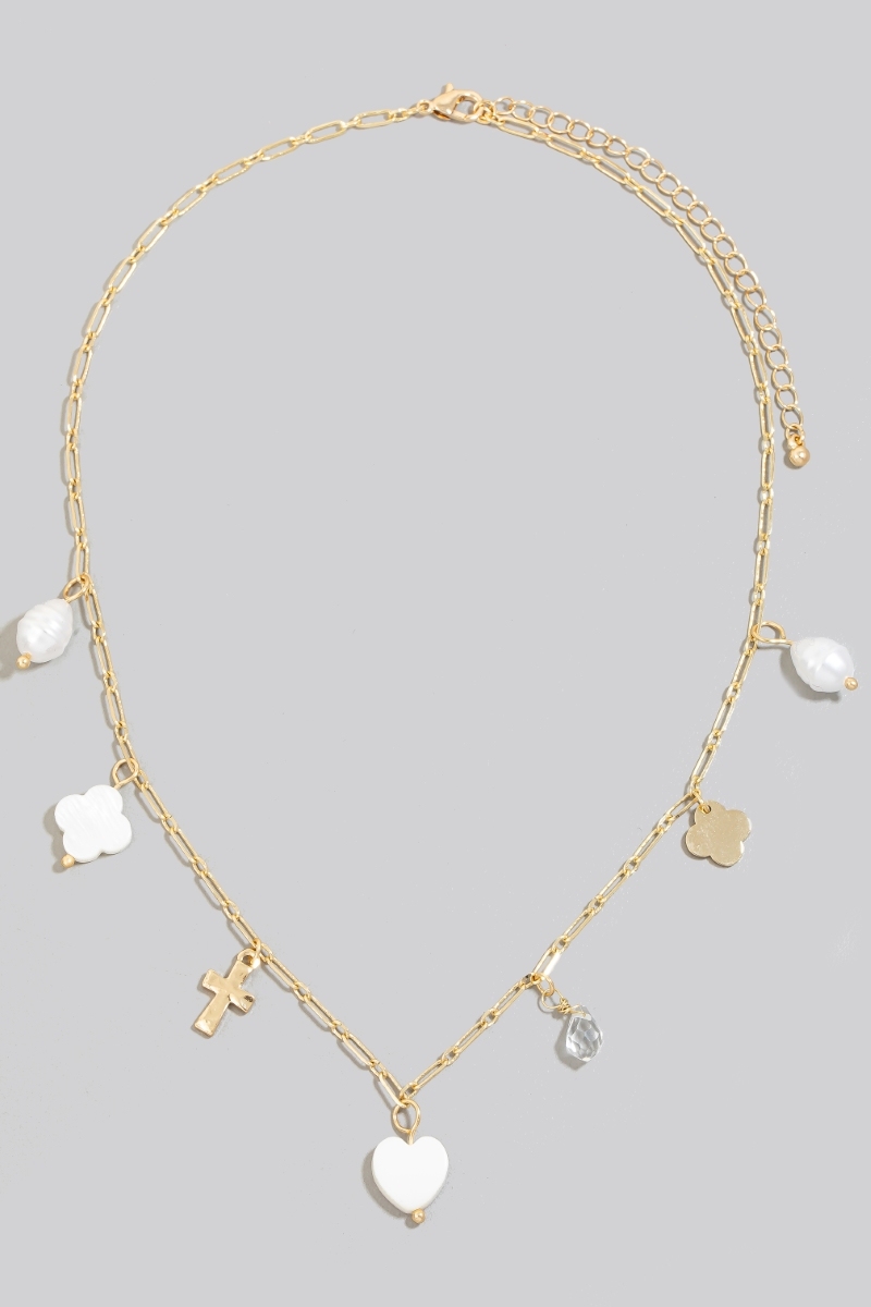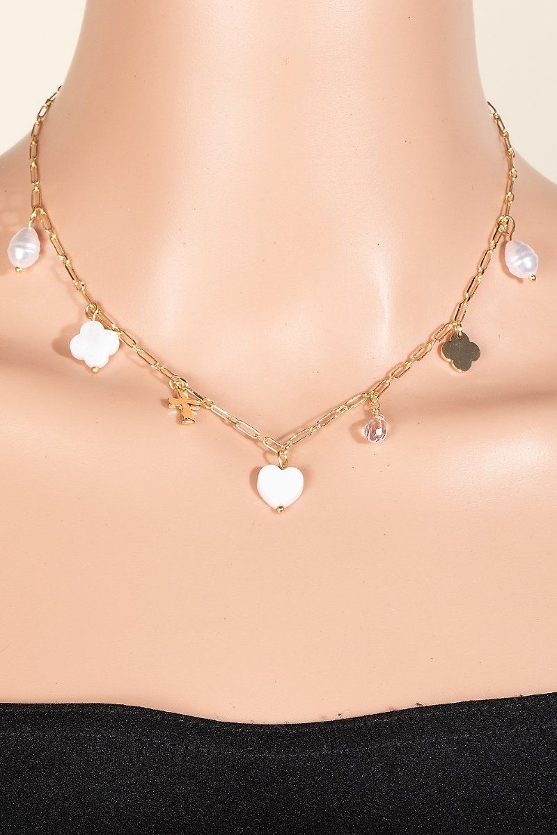 - This chain necklace showcases a unique mother of pearl clover and heart charms style. Celebrate individuality with this chain necklace that effortlessly expresses your unique sense of style.