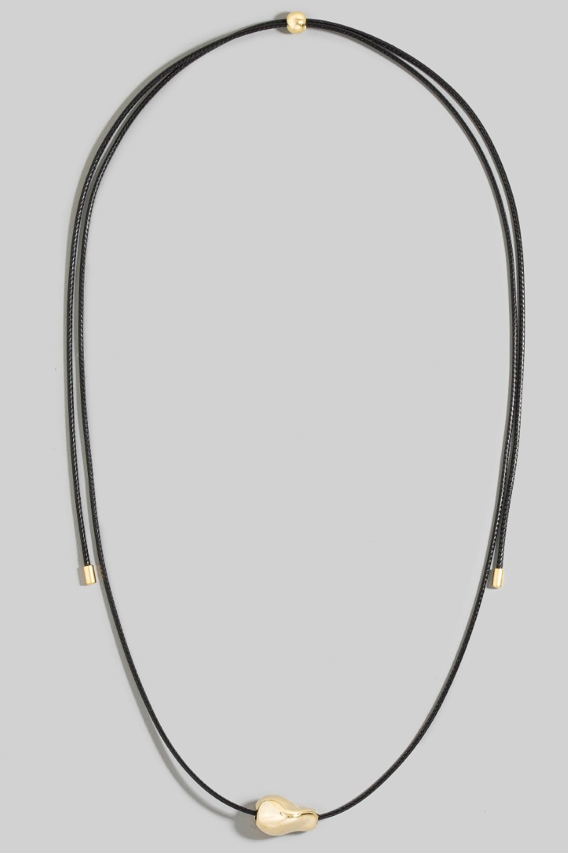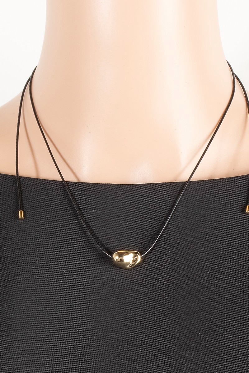 • This necklace introduces a stunning warped metallic pendant adjustable cord style. Celebrate the art of accessorizing with this piece that effortlessly encapsulates modern trends.