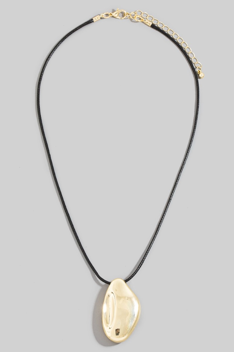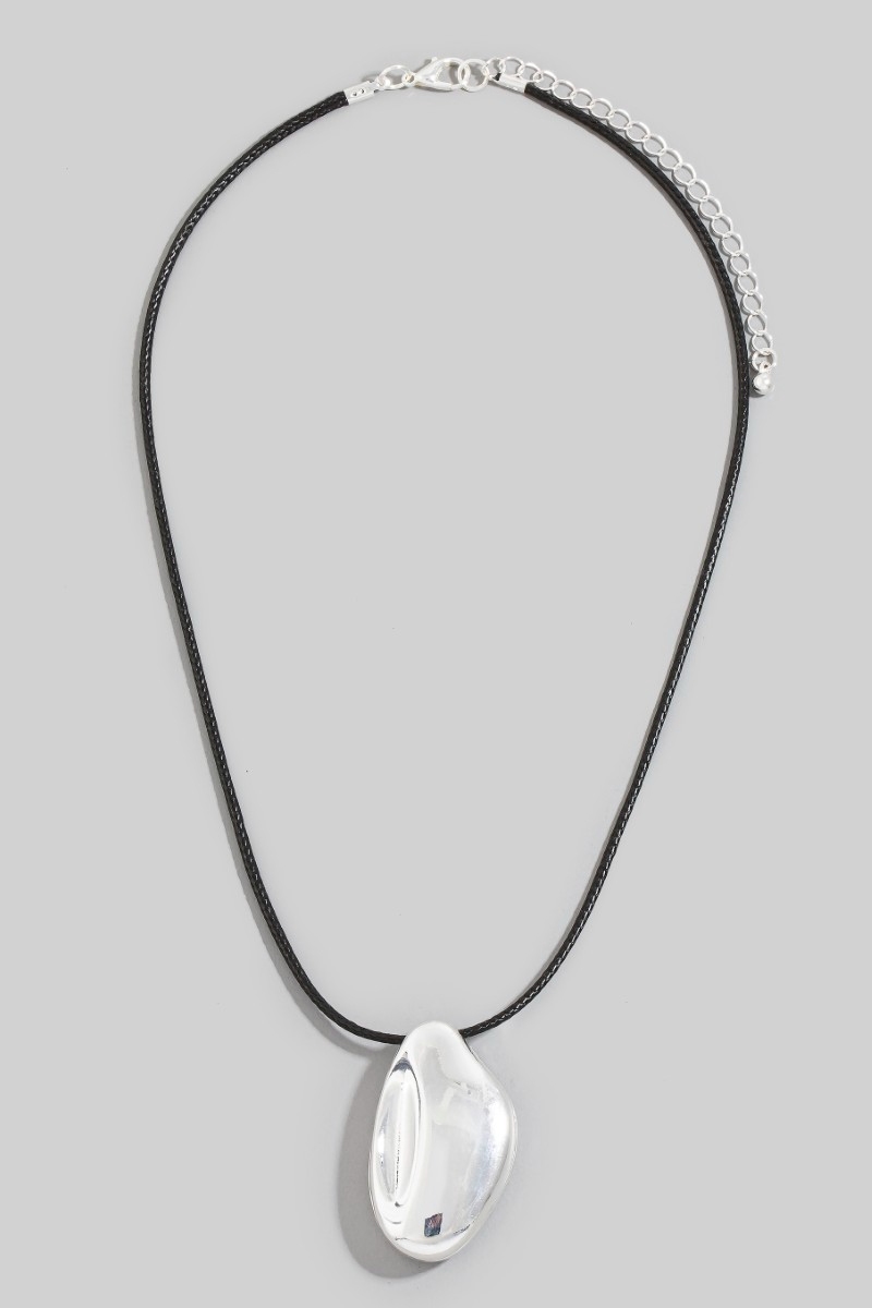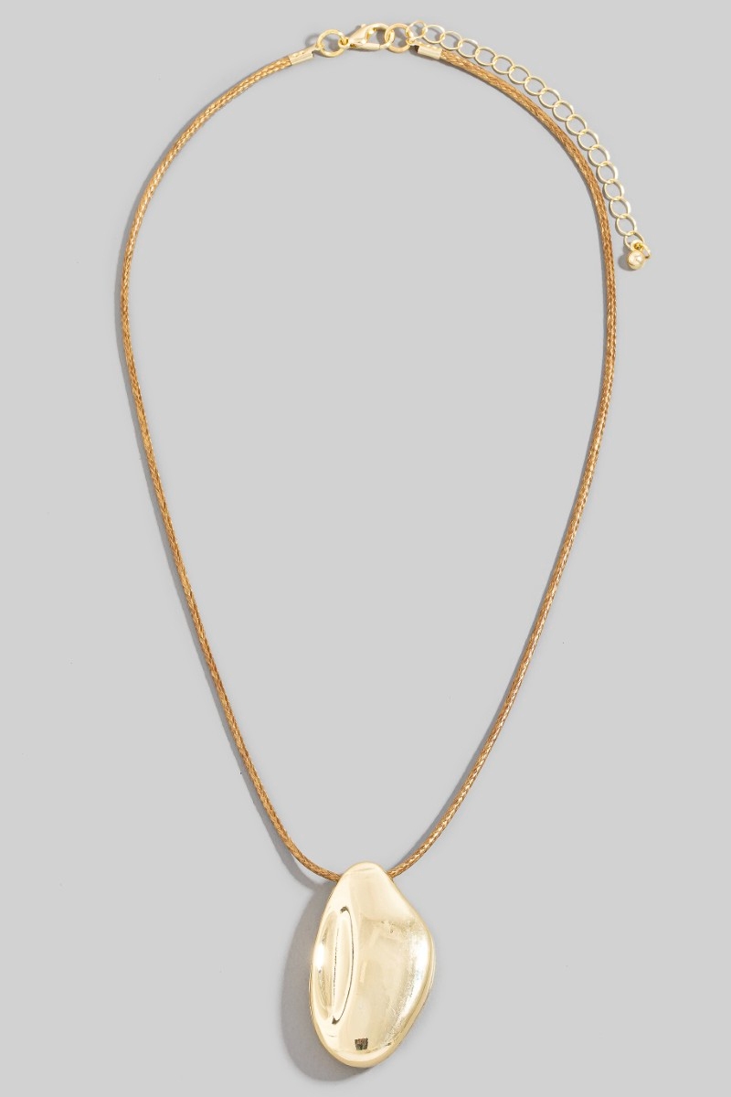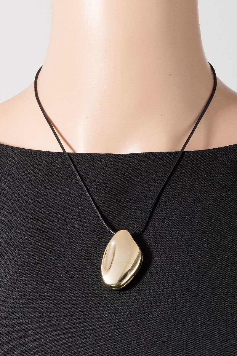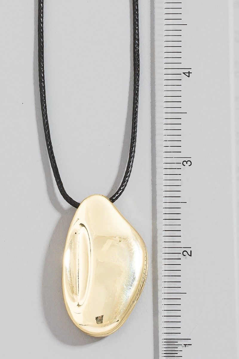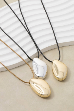 • This necklace showcases a timeless metallic bean shape pendant cord style. Celebrate individual style with this versatile, eye-catching addition.