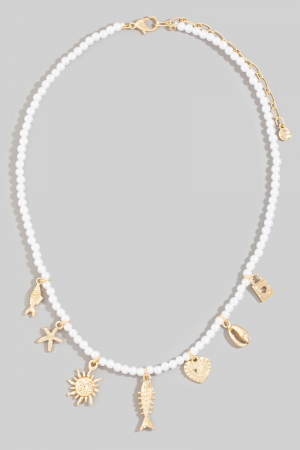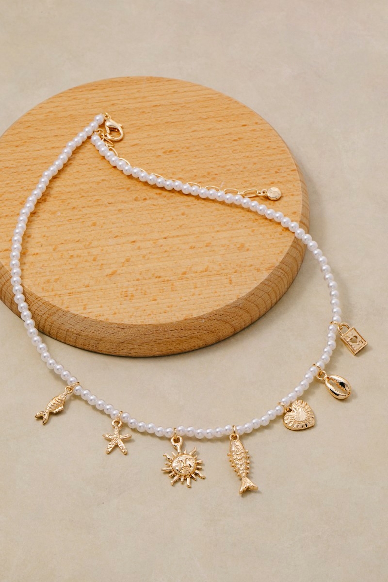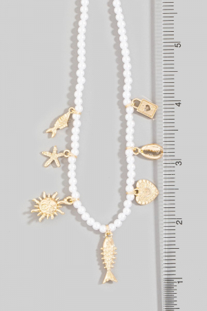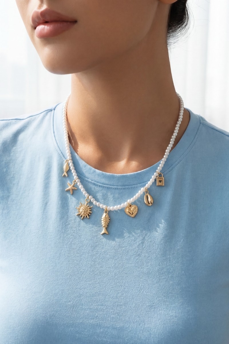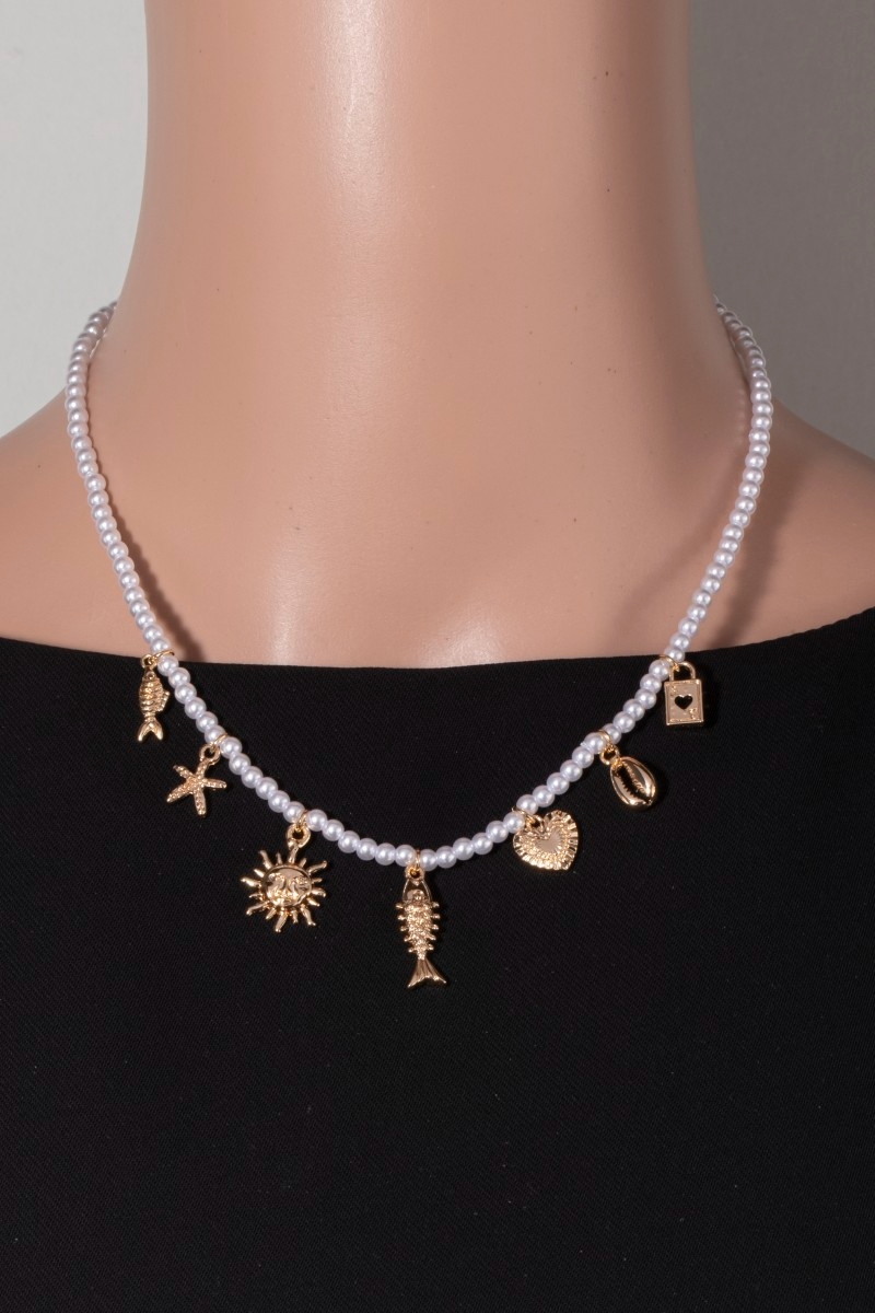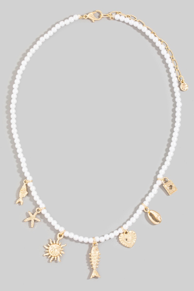 - This necklace brings a stunning metallic sea life charms pearl beaded style. Experience refined sophistication with this understated yet stylish piece.