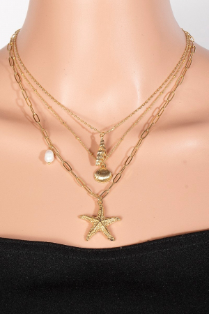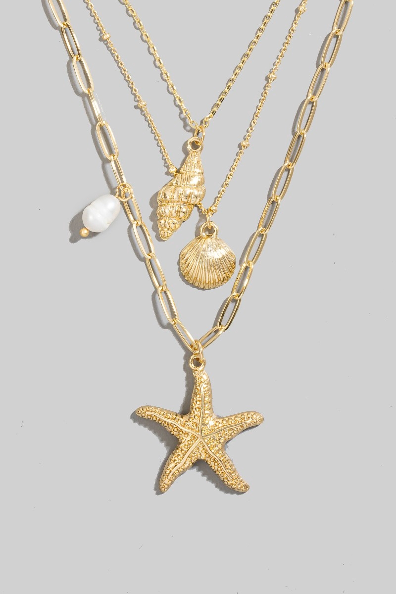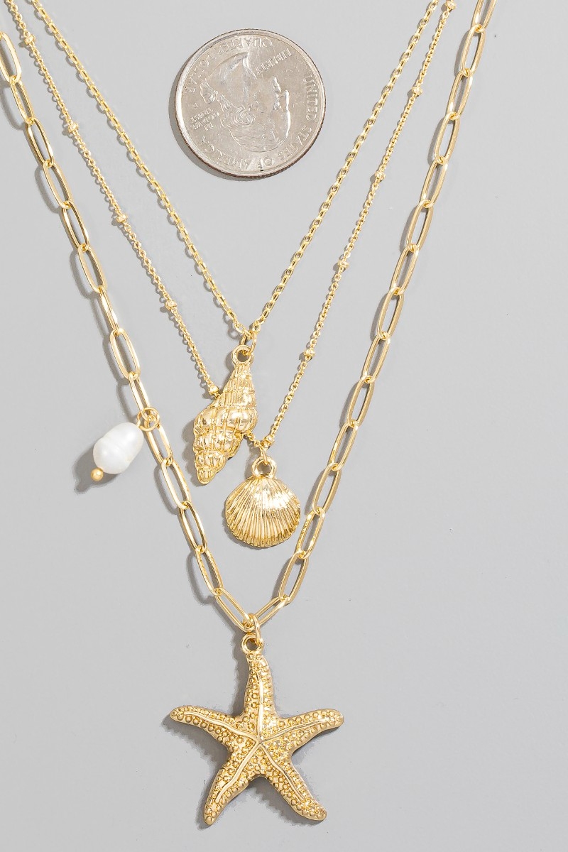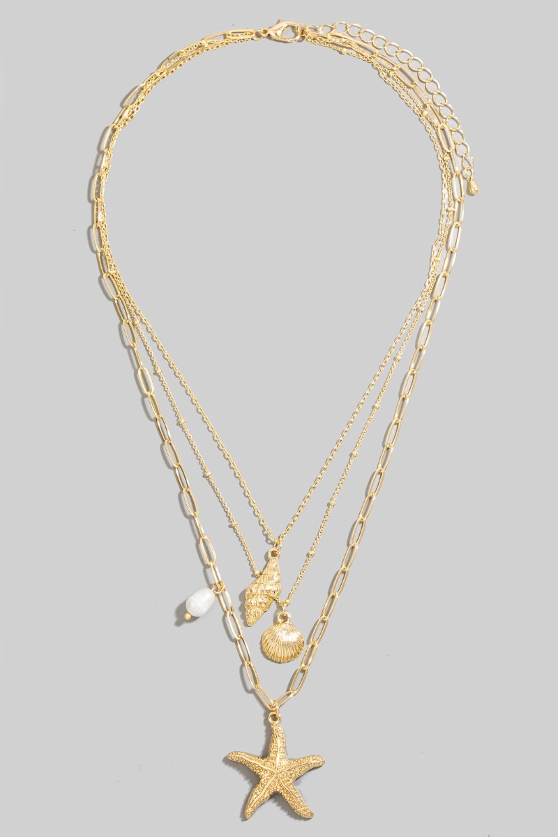 - This chain necklace brings a luxurious mixed sea shells and pearl charms layered style. Immerse yourself in the world of understated glamour as this chain necklace effortlessly exudes timeless appeal.