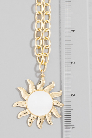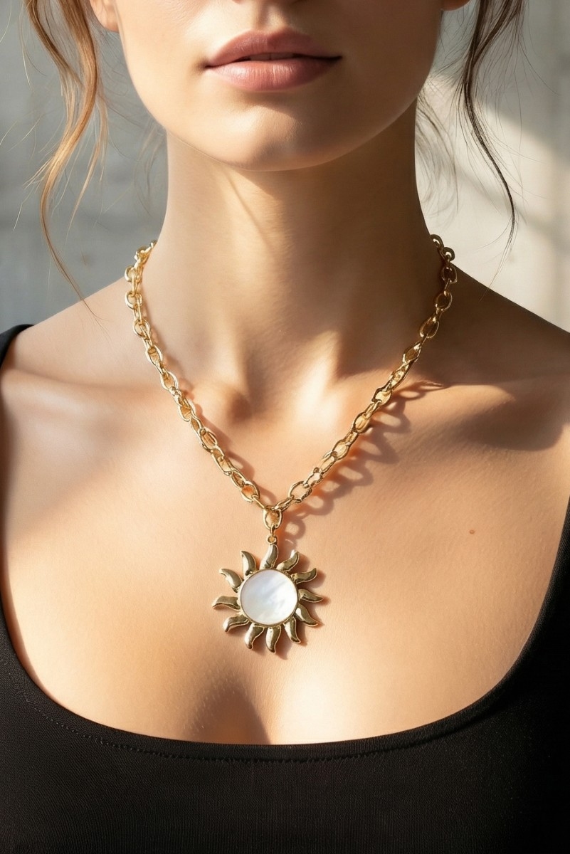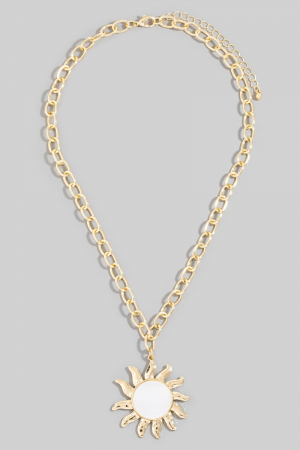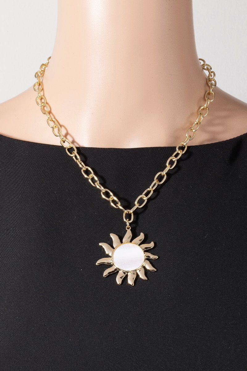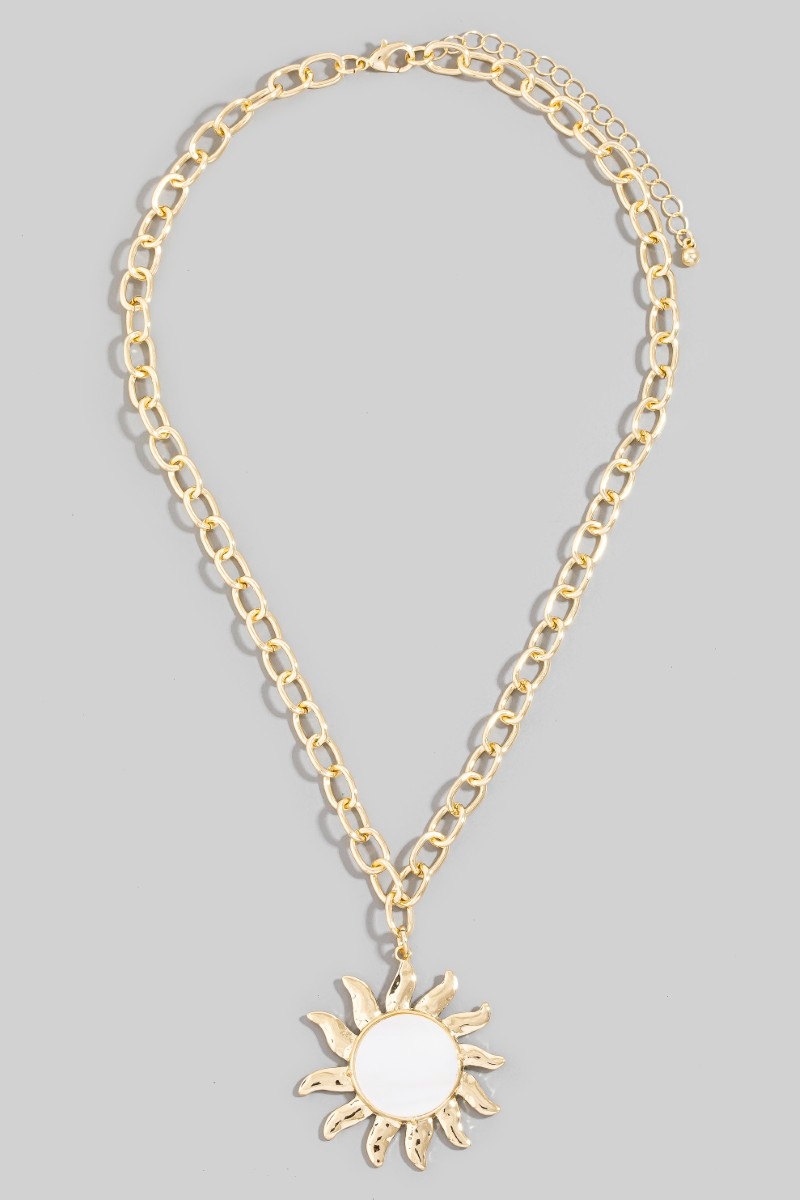 • This chain necklace brings a unique mother of pearl sun pendant style. Redefine your look effortlessly with this standout, on-trend piece.