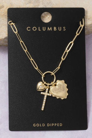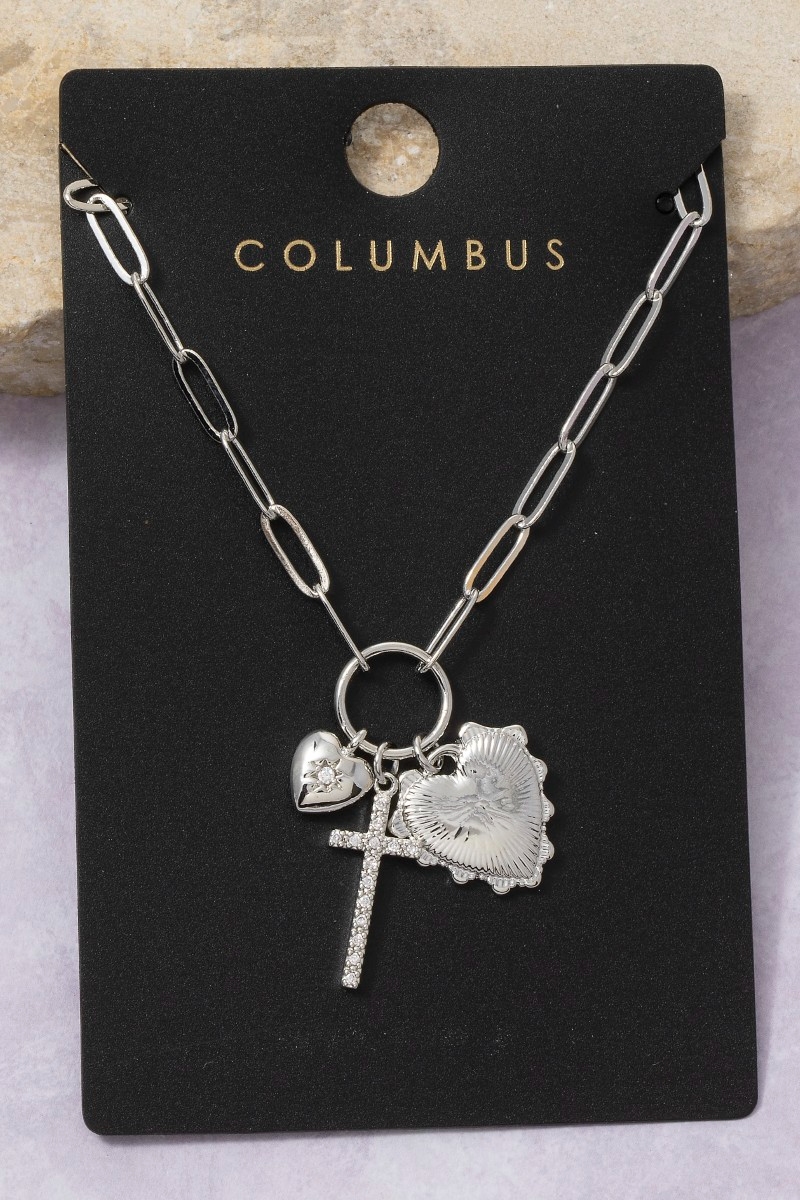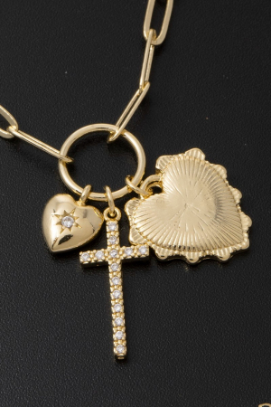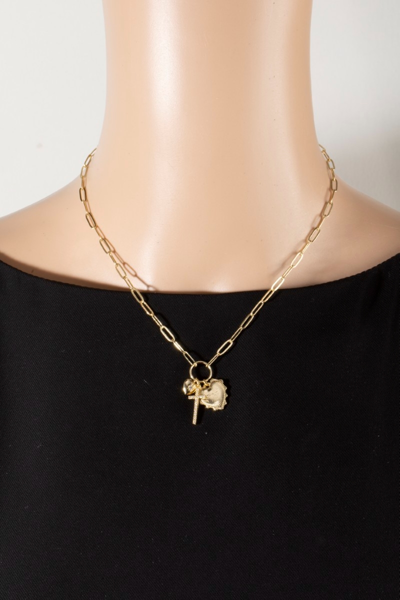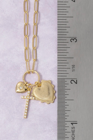 • This chain necklace displays a fashionable multi-charm heart & cross paperclip style. Celebrate the art of accessorizing with this piece that effortlessly encapsulates modern trends.