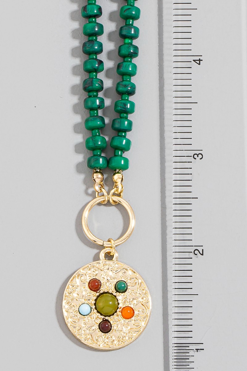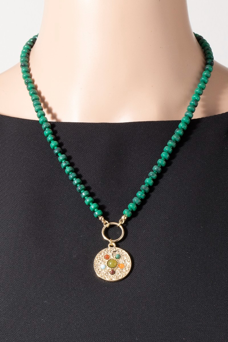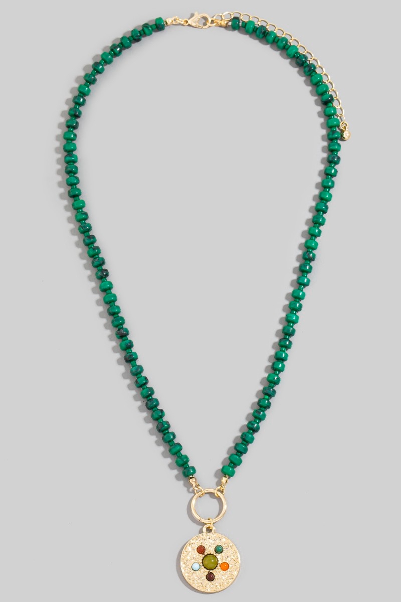 • This pendant necklace showcases a timeless intricate coin pendant green stone beaded necklace style. Celebrate individual style with this versatile, eye-catching addition.