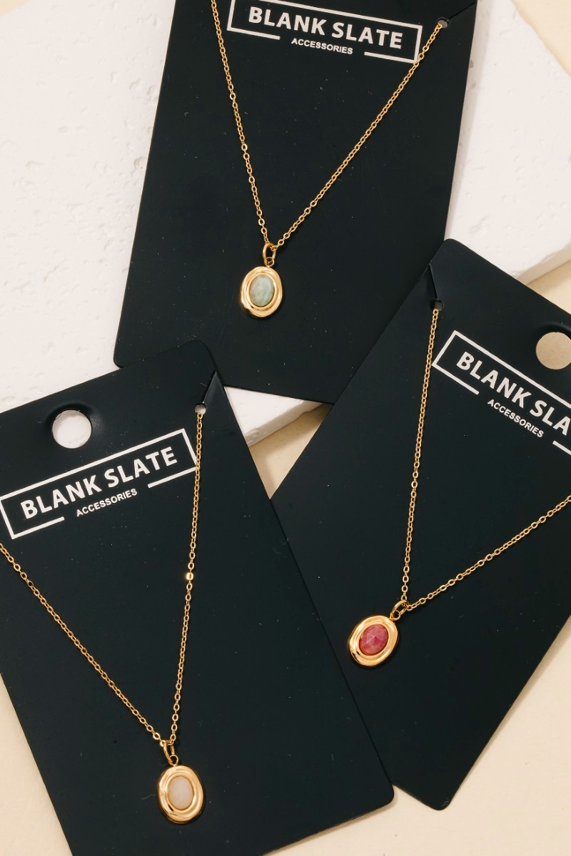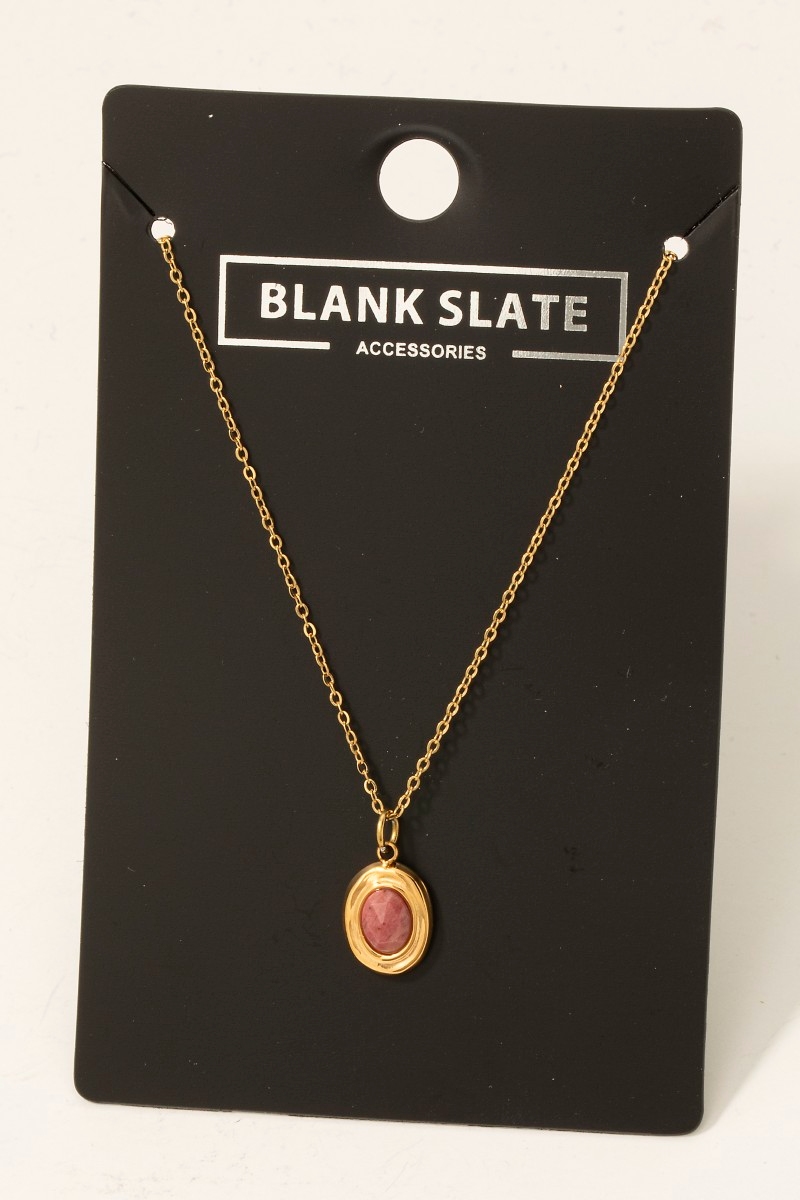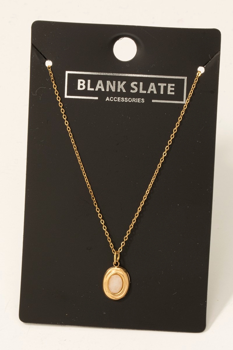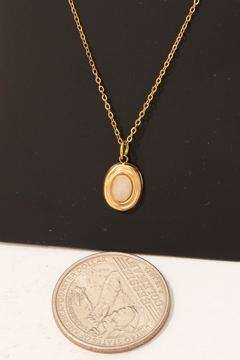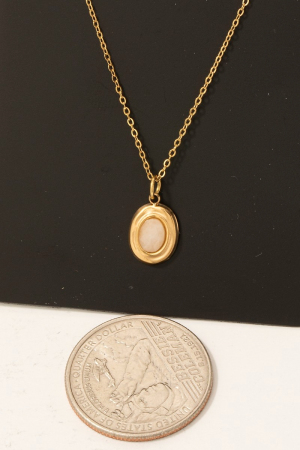 • This necklace showcases a timeless stainless steel oval stone set pendant style. Savor the craftsmanship that goes beyond the ordinary, as this necklace effortlessly captivates attention.